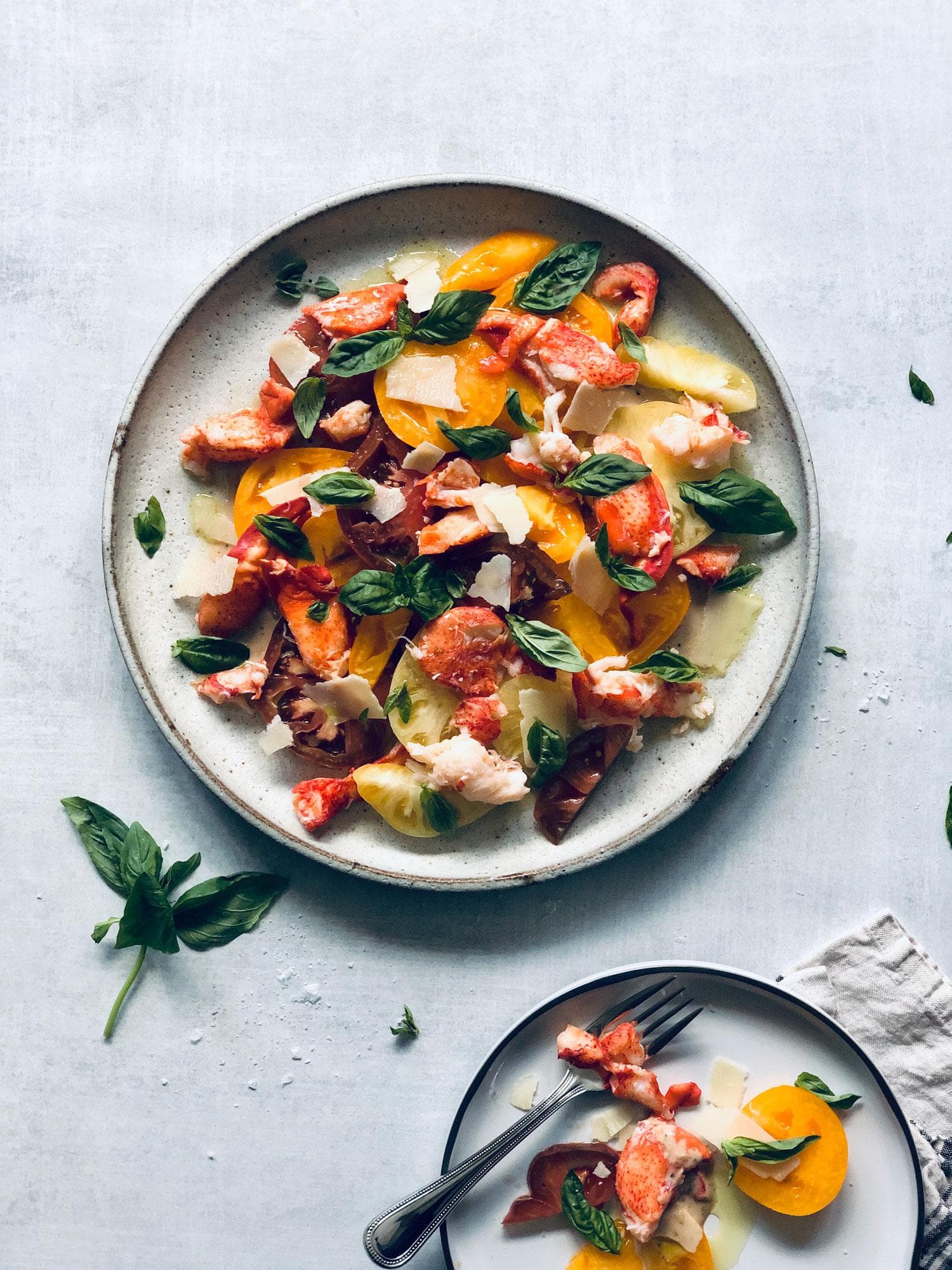 To plate: Pour dressing into a large, shallow serving bowl or platter and top with tomatoes and lobster. Sprinkle tomatoes and lobster with fleur de sel, drizzle with olive oil, and finish with parmesan and basil.