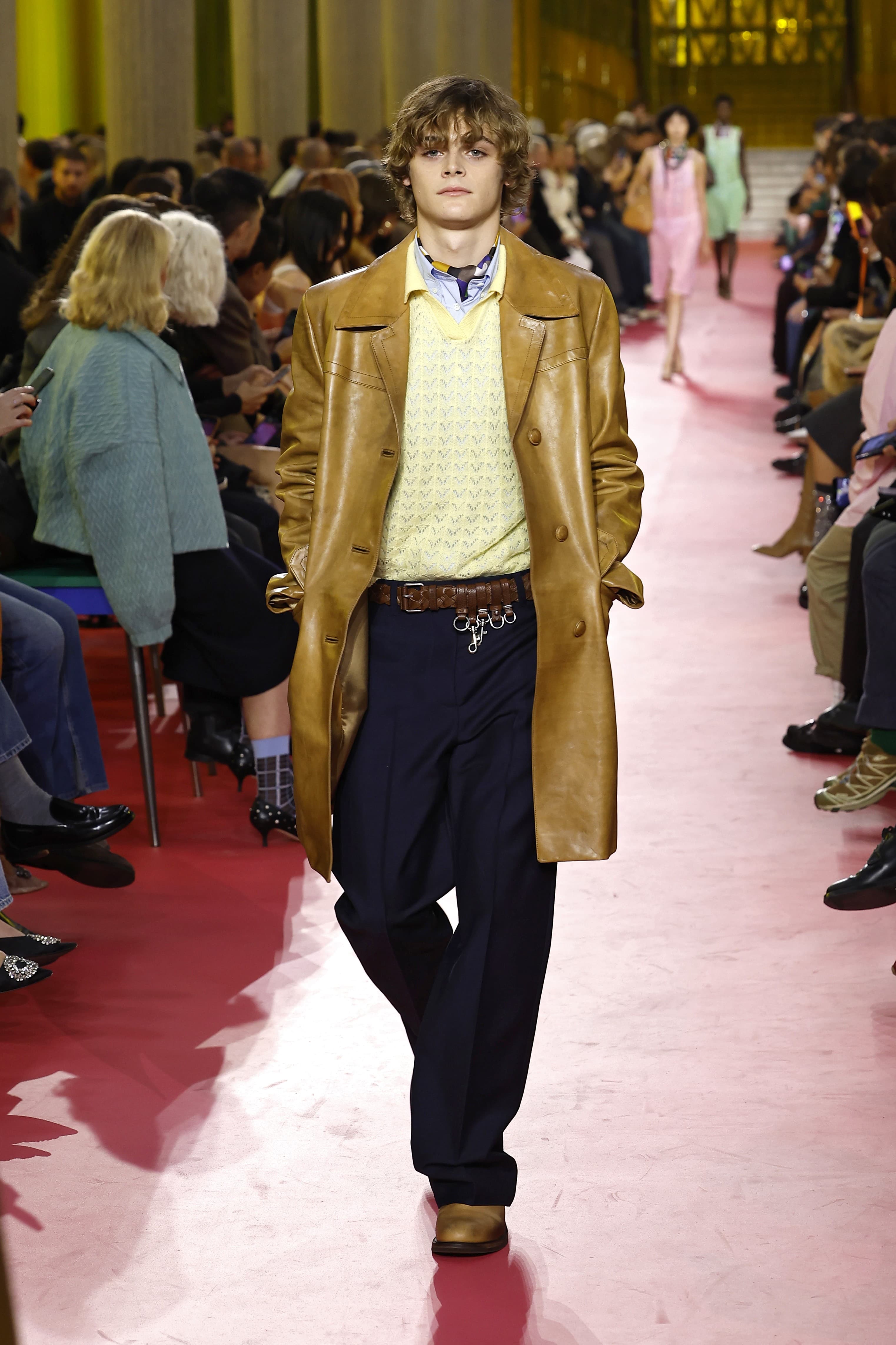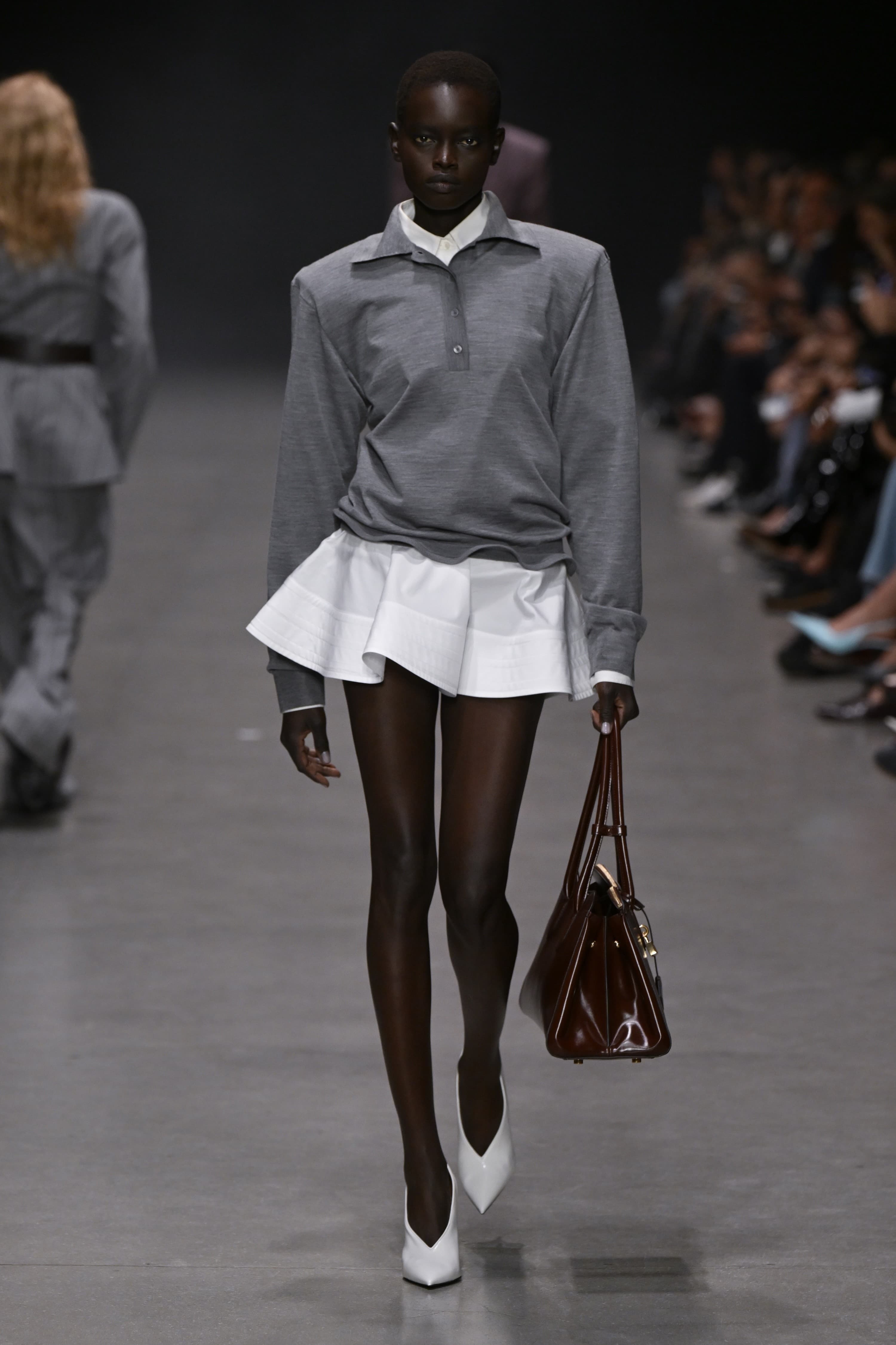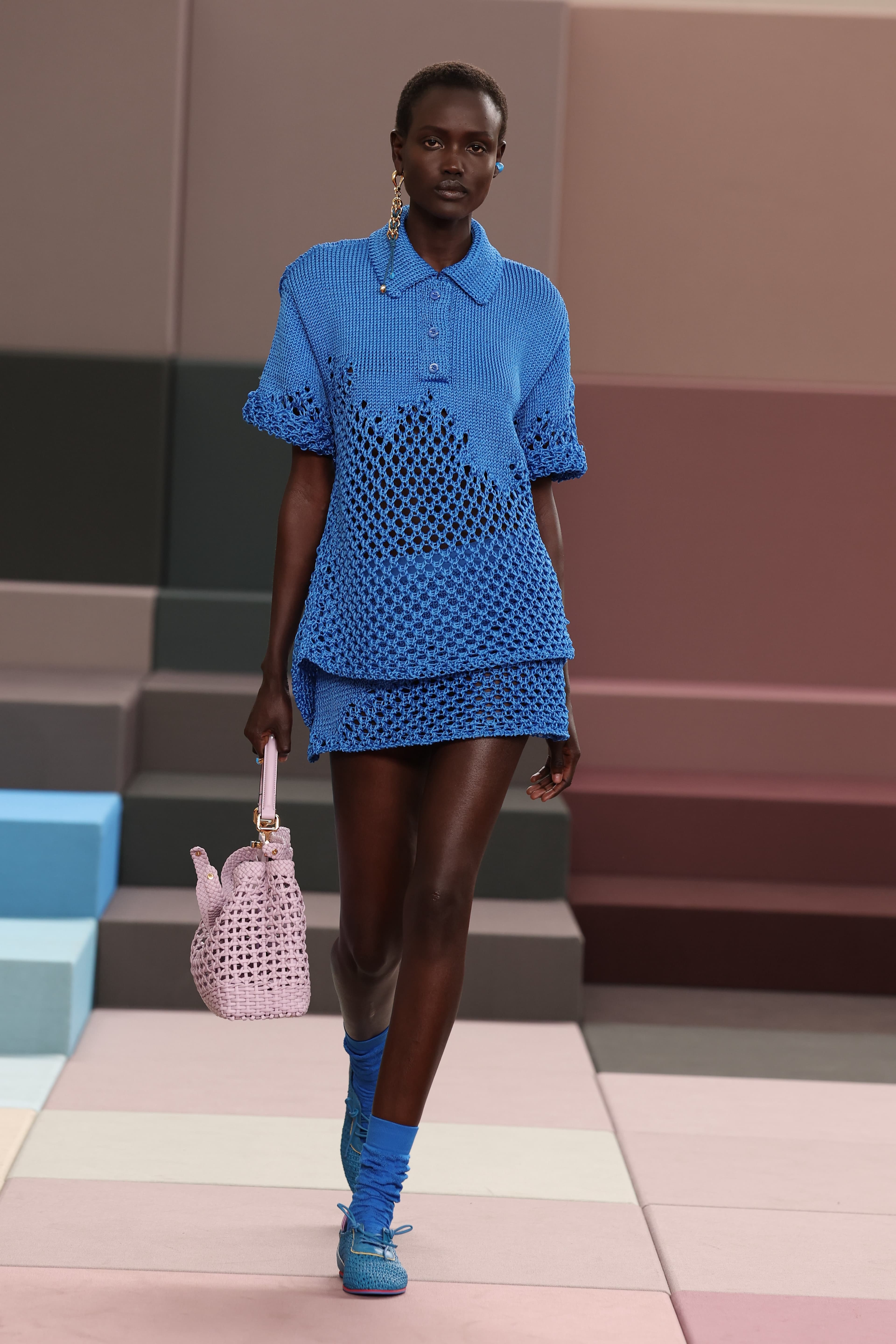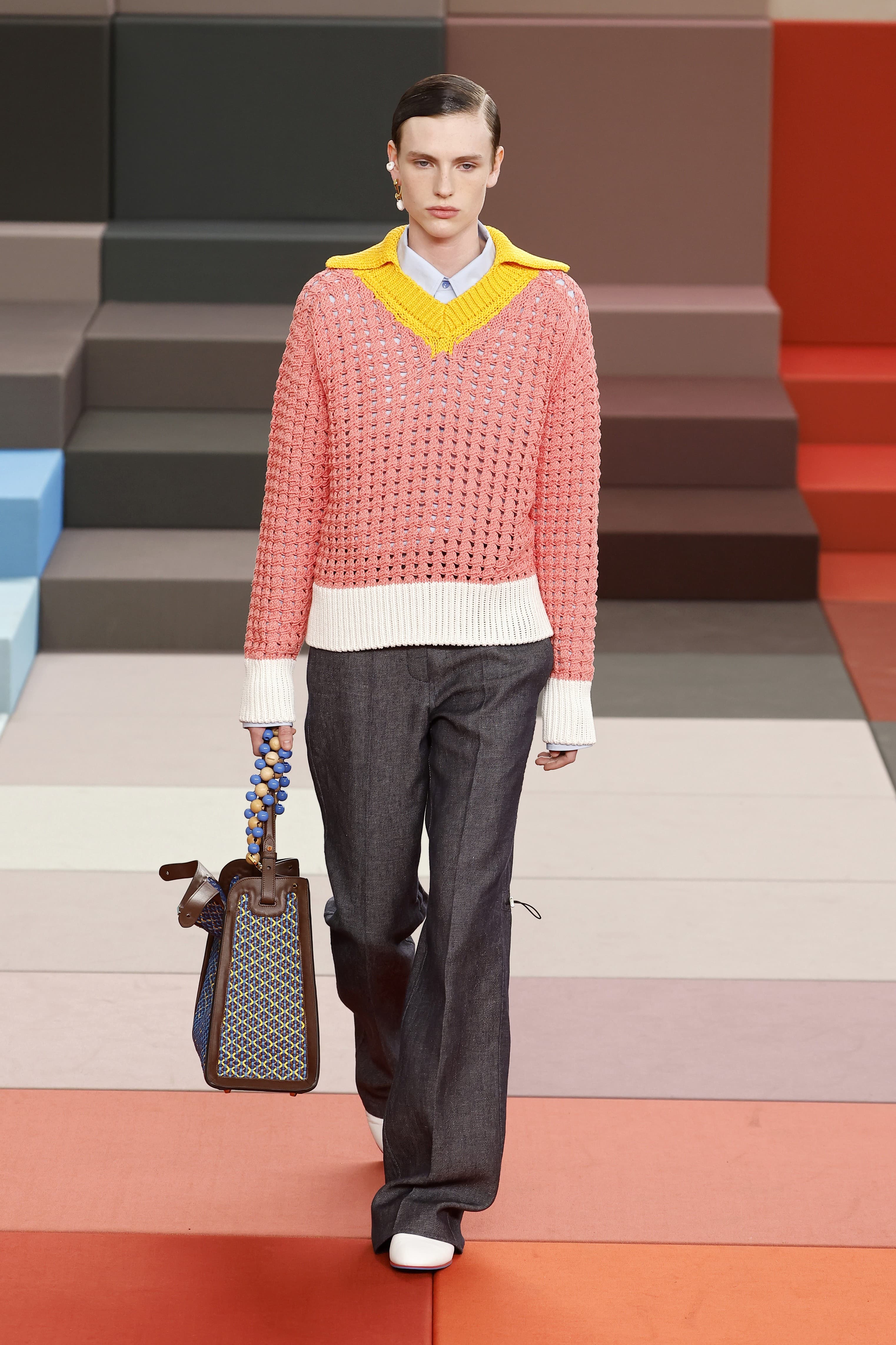 At Fendi, a handful of polo knit interpretations were put on display: black crochet with red and green floral embroideries, a bright cerulean blue with a matching skirt, and a series of color blocked options, both long sleeved and short. Other designers embraced this preppy style, too: Stella McCartney with a classic gray option that would be simple if not for the boxy, over exaggerated shoulders, and Miu Miu with a knit in the perfect spring yellow.