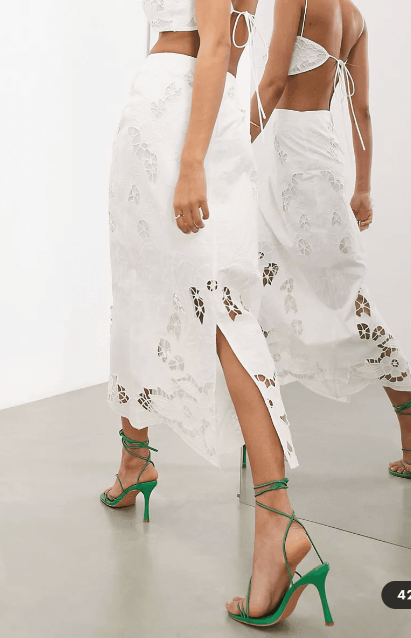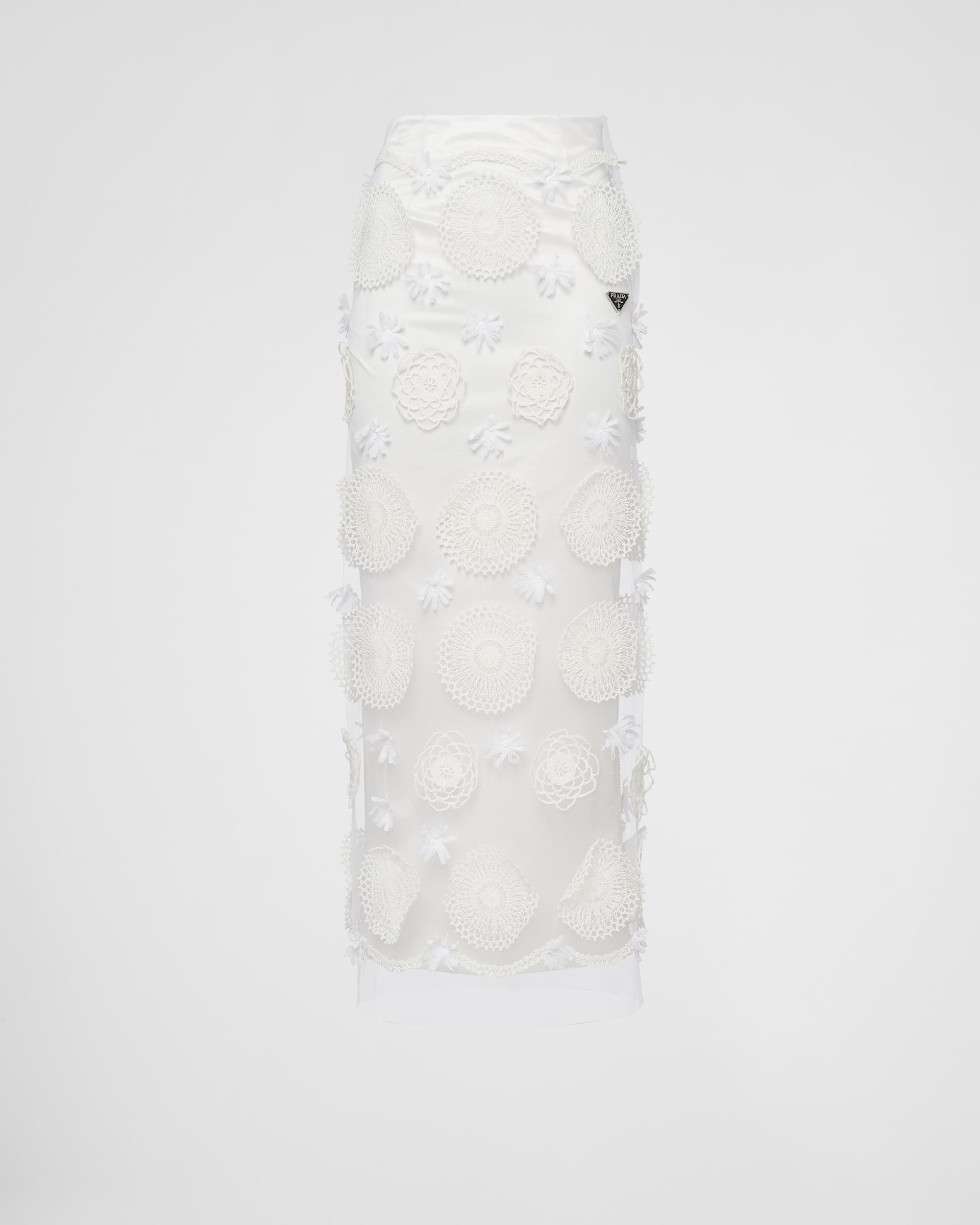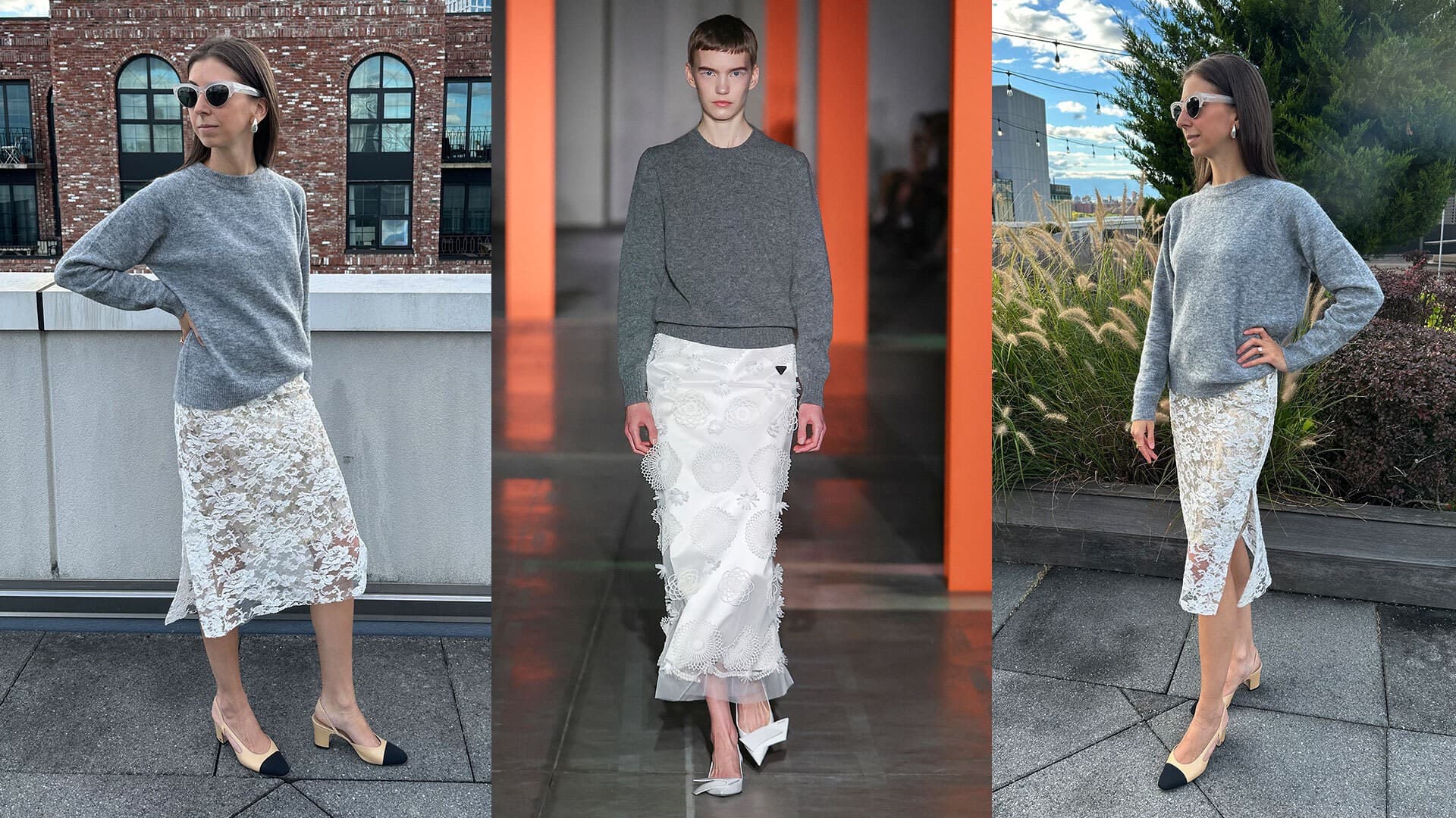 To pull you out of that mid-autumn funk, look no further than Prada’s Fall 2023 Collection—specifically, the opening look of a slightly slouchy charcoal crewneck and a white midi skirt, scattered with floral, almost doily-like appliqué. In the much-buzzed-about collection, Miuccia Prada and Raf Simons sought to reinterpret uniform dressing, contrasting formal occasionwear with more practical, quotidian pieces. Spotted on the streets throughout all four cities during this most recent Fashion Month, the Prada knit-and-skirt pairing is a hit for various reasons. You’re getting more use out of a rarely worn, formal-leaning skirt that you may generally reserve for evening; it’s an unexpected way to elevate those basic-but-essential sweaters. And you likely have these pieces in your closet already—you’re just not thinking of wearing them this way. (Should you need further convincing, it’s also been Mrs. Prada’s iconic go-to uniform for years now.)