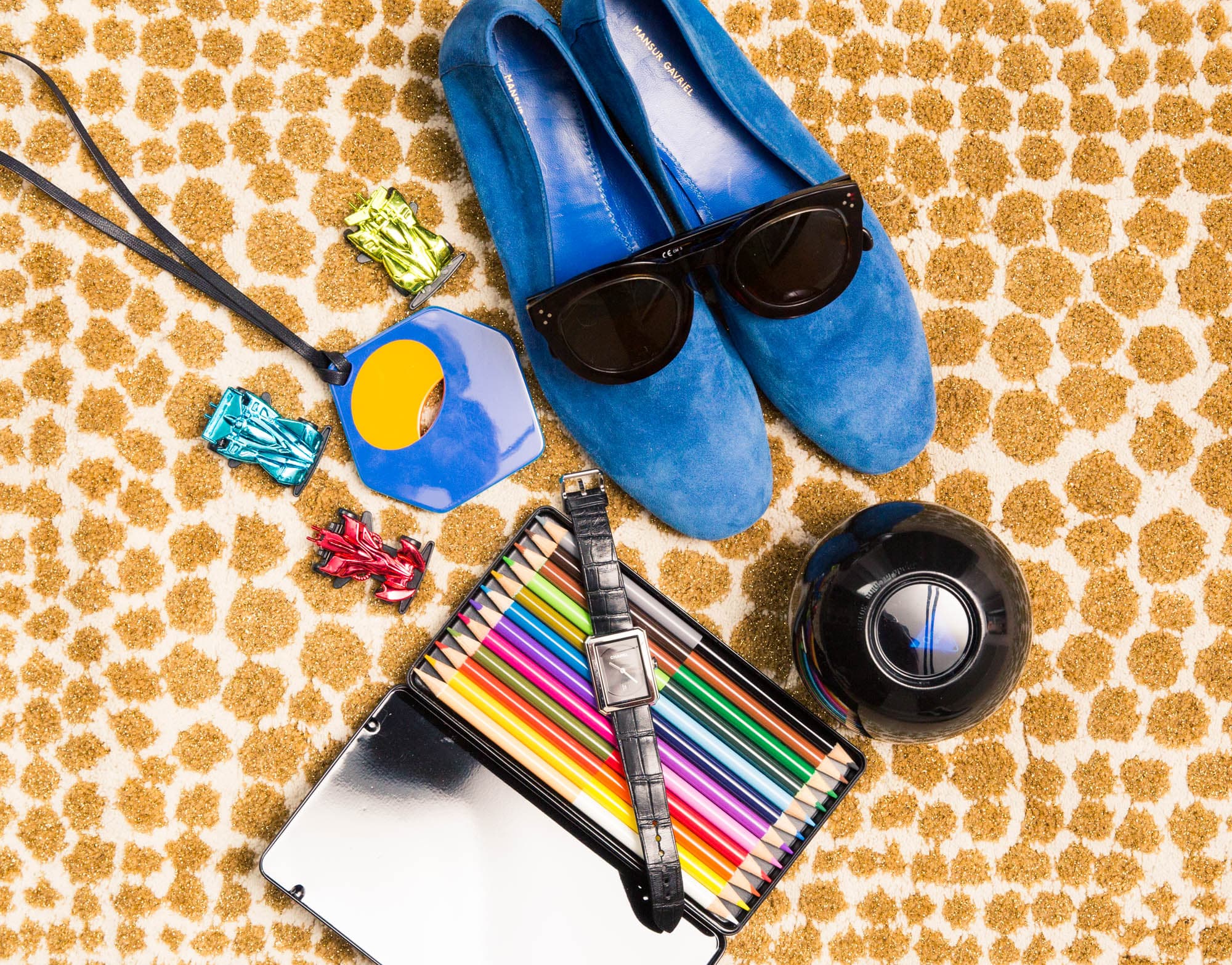 Clockwise from left: Necklace, Hermès, hermes.com. Sunglasses, Céline, sunglasshut.com. Loafers, Mansur Gavriel, mansurgavriel.com. Watch, CHANEL, chanel.com.