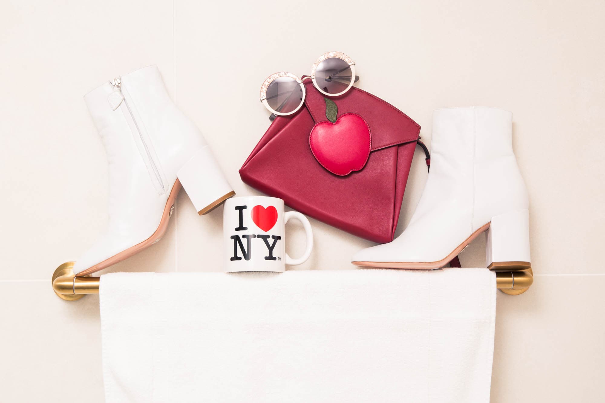 Love NYC so much you want to wear an outfit inspired by it? Same. Pair some mod, white boots with a (big) apple embellished bag, and a pair of sparkly-as-hell sunglasses.