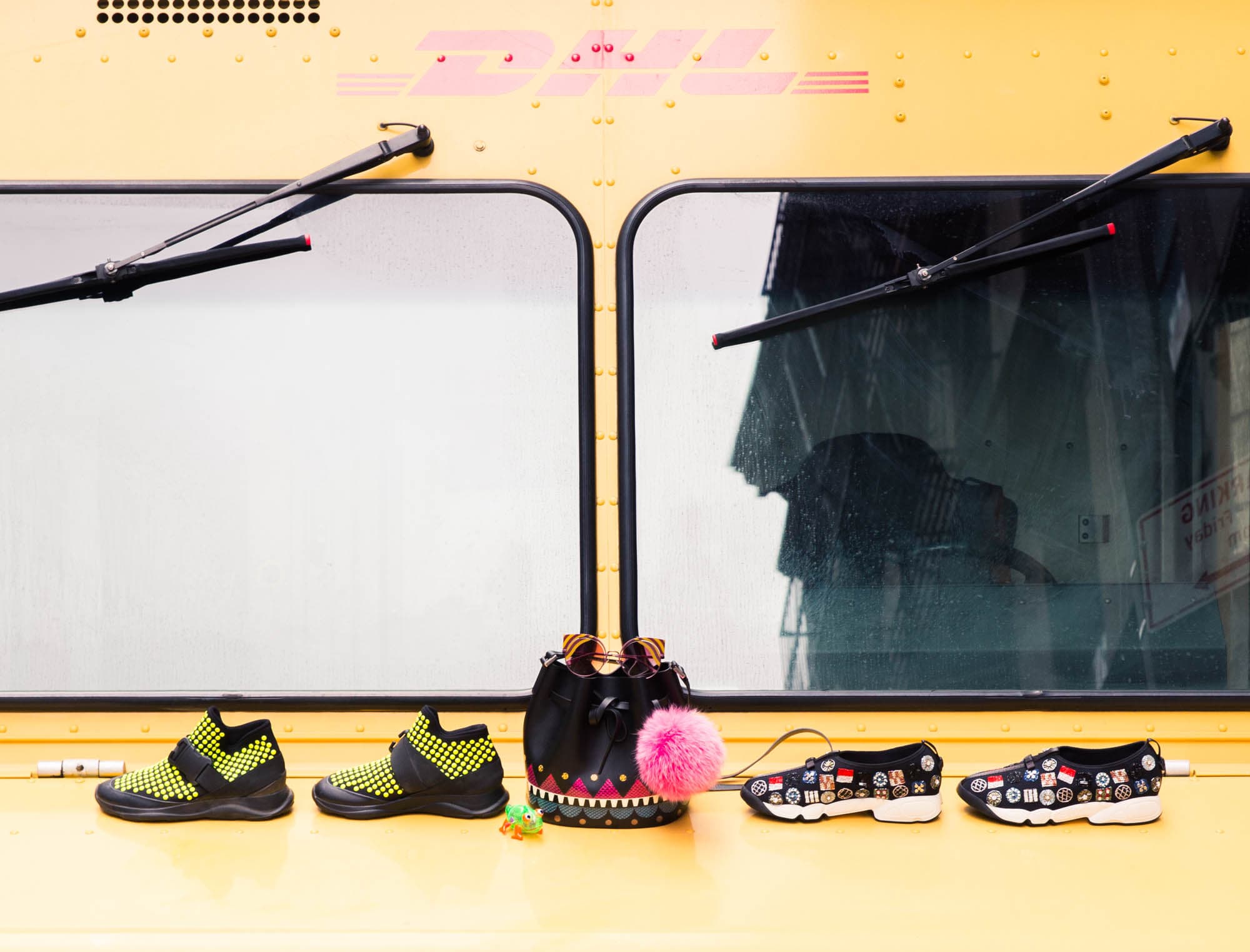 From left: Sneakers, Christopher Kane, mytheresa.com for similar. Sunglasses, Fendi, fendi.com. Bag, Les Petit Joueurs, let-petit-joueurs.com. Sneakers, Christian Dior, Dior.com.
