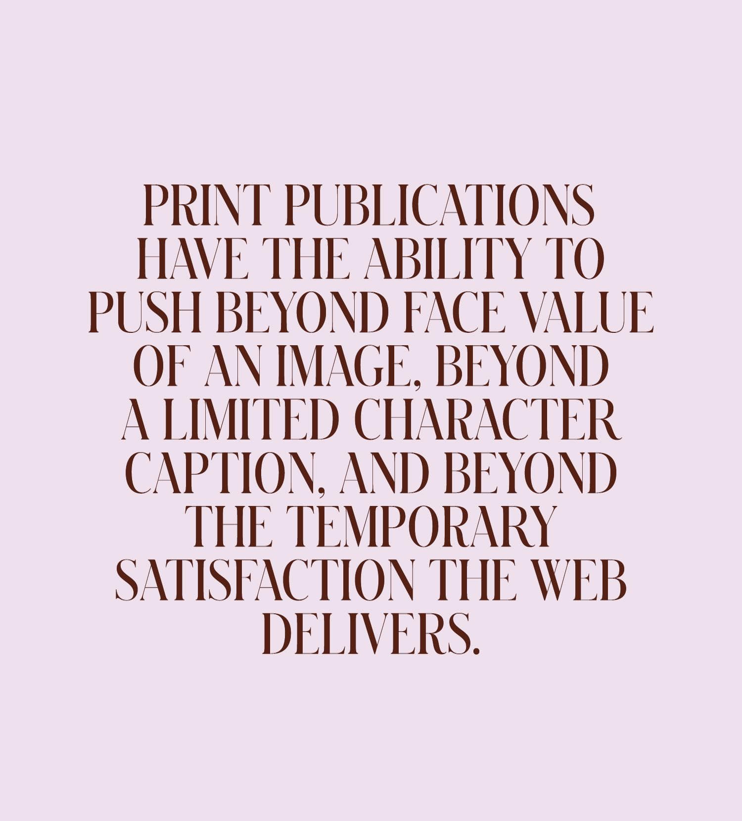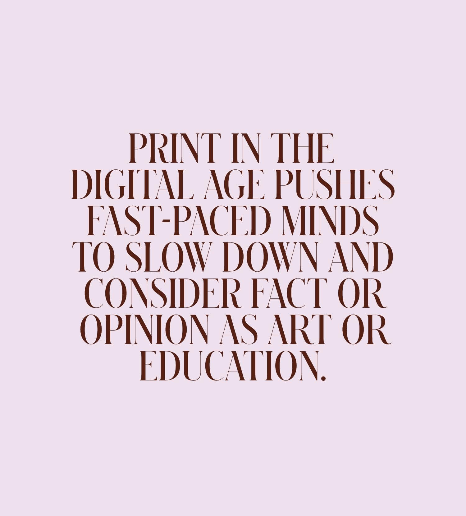 Print in the digital age pushes fast-paced minds to slow down and consider fact or opinion as art or education. The changing tides in print, guided by shrinking advertising budgets and digital's rise, encourages creative veterans on both sides of the page to envelop something smart and substantial, sophisticated and transparent. As Brielmaier put it, there is still much work to be done in terms of content and those that create it, but the industry is moving in a positive direction to capitalize on offering something creatively deeper.