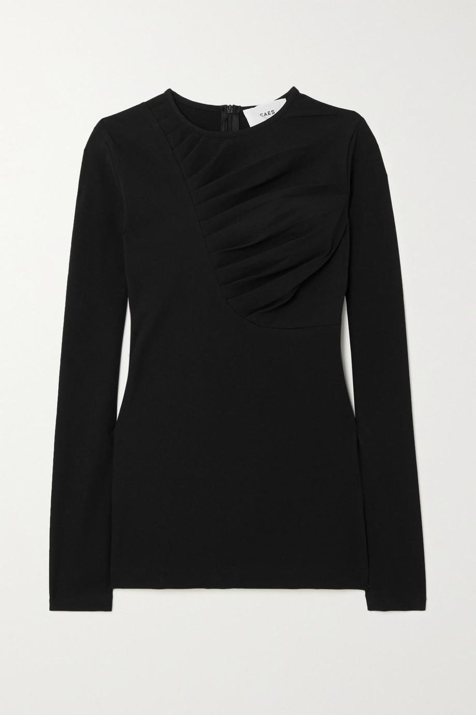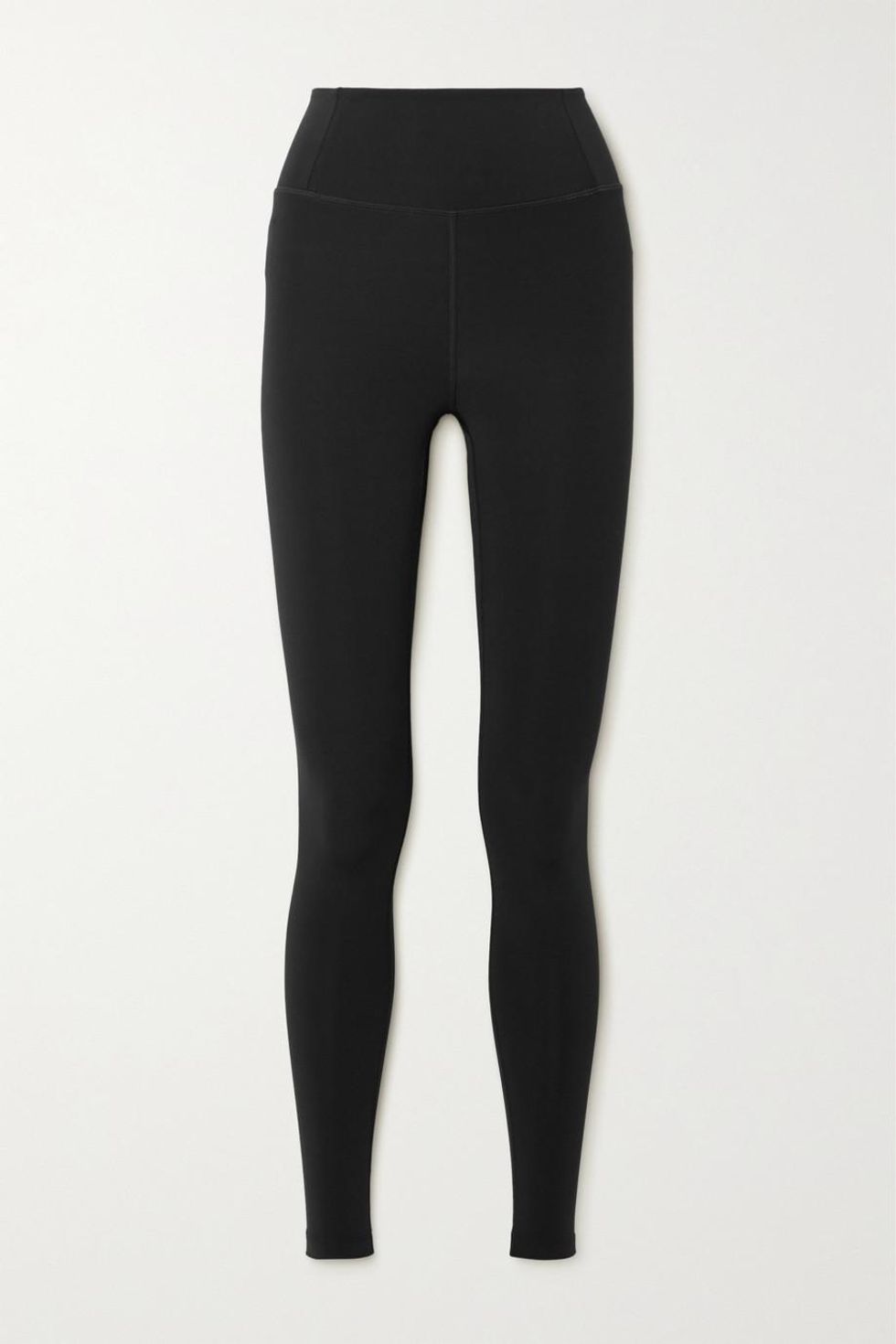 Combining a tight black top and leggings, in effect, creates a catsuit. With that as your base layer, an olive green puffer jacket layered over its top creates the perfect contrast. Socks, loafers, and your favorite everyday handbag finish the look off.