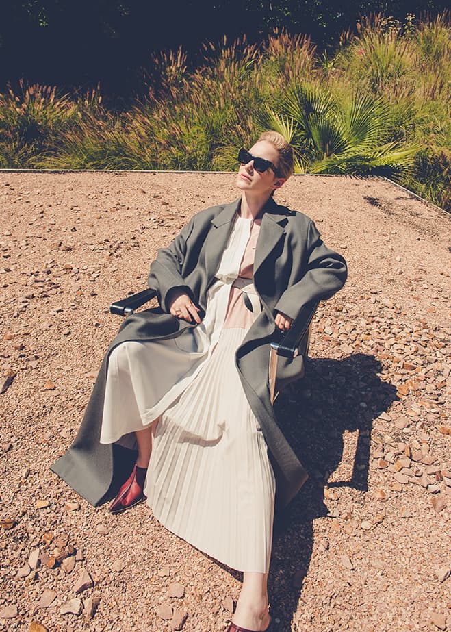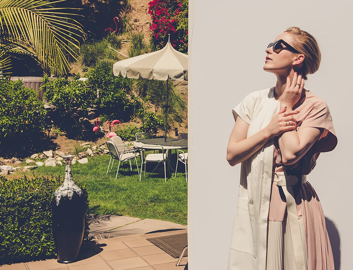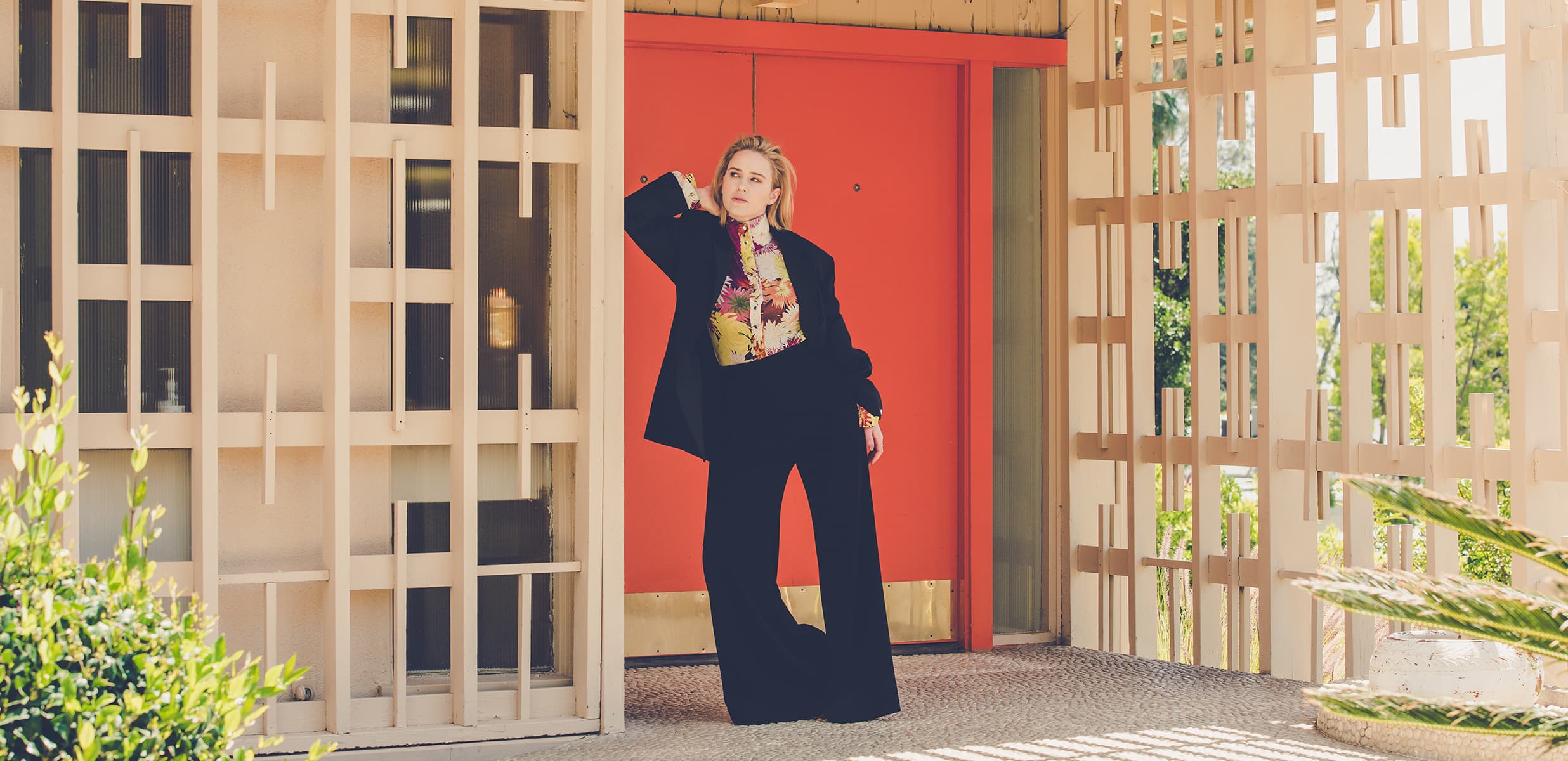 As she emerges from the pink-tiled bathroom, hair slicked back, she commands the psychedelic-print Ellery top and oversized trousers, both of which are so long they hide her appendages like they're props. “Can we play Google's Pacific Highway playlist?" She smiles, acknowledging that her music request is
