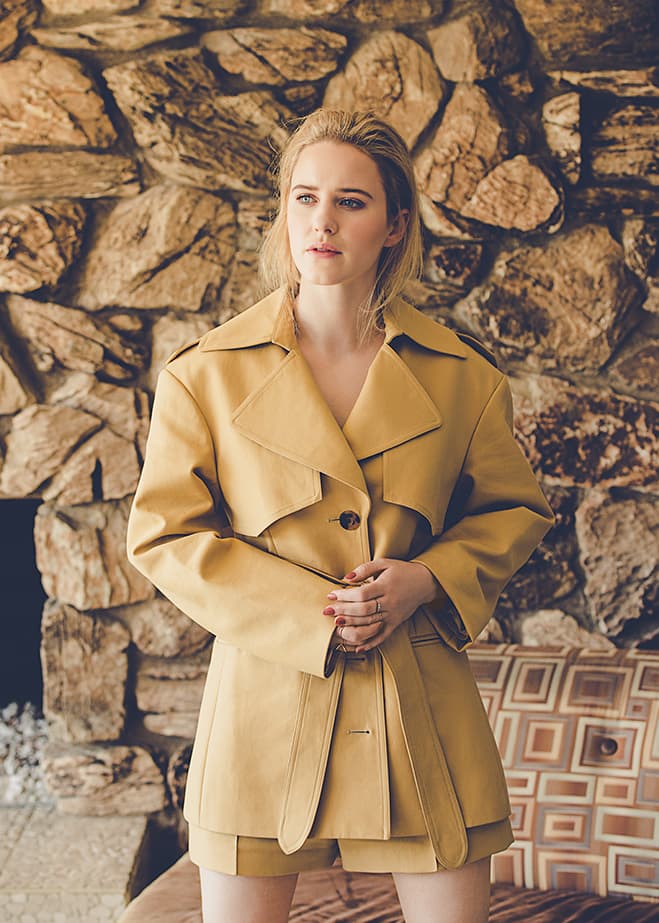 audition], so I felt like I was pulling from the deepest, darkest parts to get it all out there,” she says, shooting upright to motion at her core. Even in this moment, as Brosnahan curls up on a Vladimir Kagan-esque serpentine sofa after four hours of wardrobe changes and photos, I catch glimpses of Midge piercing through like flashes in sharp-tongued cadence. “I was feeling so shitty that I had no choice but to lay it all on the line. I had nothing to lose by trying things I had never tried before in the room, and throwing down and walking out,” she explains. And she got it. It’s hard to imagine how executive producers Amy Sherman-Palladino and Daniel Palladino could, or would, cast anyone else.
