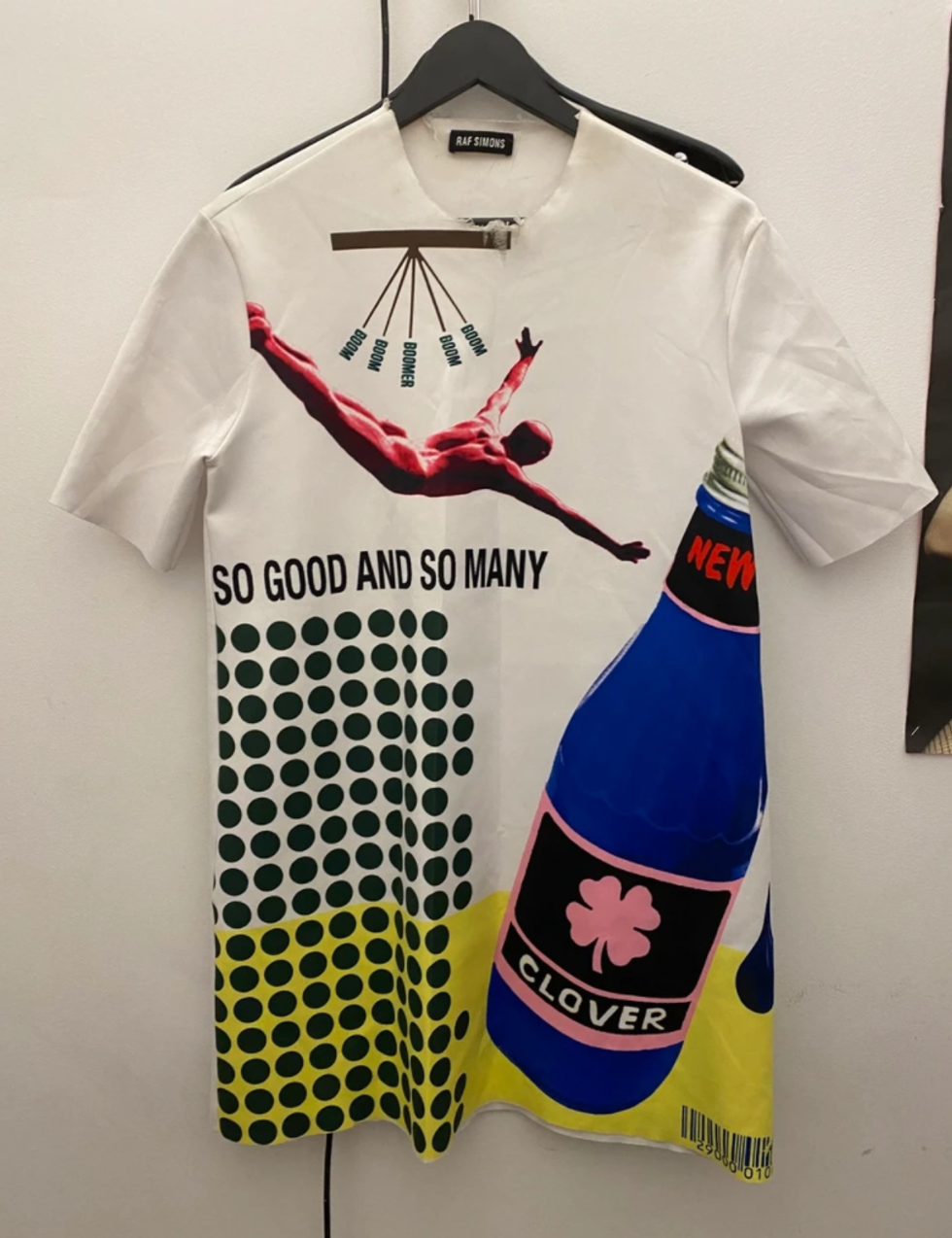 “This is a Raf Simons men's tunic dress from spring 2014. I got it in 2016 at a Soho vintage store that no longer exists for $90, and it was wedged between a bunch of pastel dresses you might wear for a sorority sister's dubious wedding. I felt high when I found it. Sometimes I wear it as I suppose Raf would intend, with a big pair of black brogues and little shorts, but I also like to wear it like a crazy flighty wasp would. This is a black leather belt from J. McLaughlin (from 2010—if you only buy things you love, you keep everything!) and nude boots from J.Crew (from this year), and another cool necklace from my grandmother—this one jangly, and I think a trinket from time spent traveling in Turkey.
