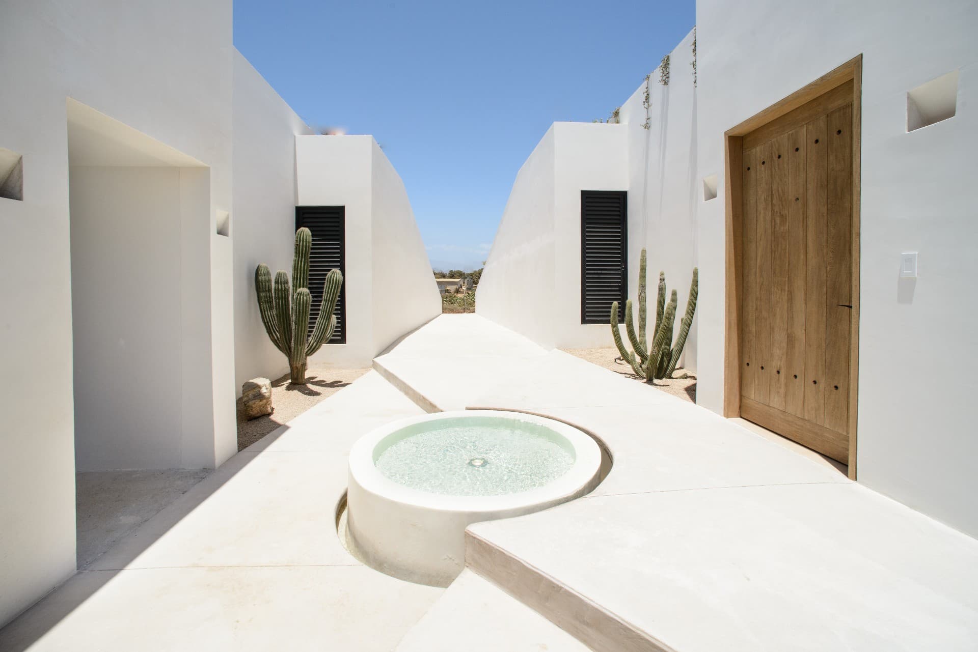 The entrance to Rancho Pescadero is inconspicuous—a mile-long drive down a dirt road and around a short driveway leads to a towering wood door. The door swivels open, revealing a beachfront desert oasis. “The moment you step foot inside you feel the soul of the space,” says Alejandra Templeton, the female Mexican architect Rancho Pescadero hired to spearhead the property’s design overhaul.
