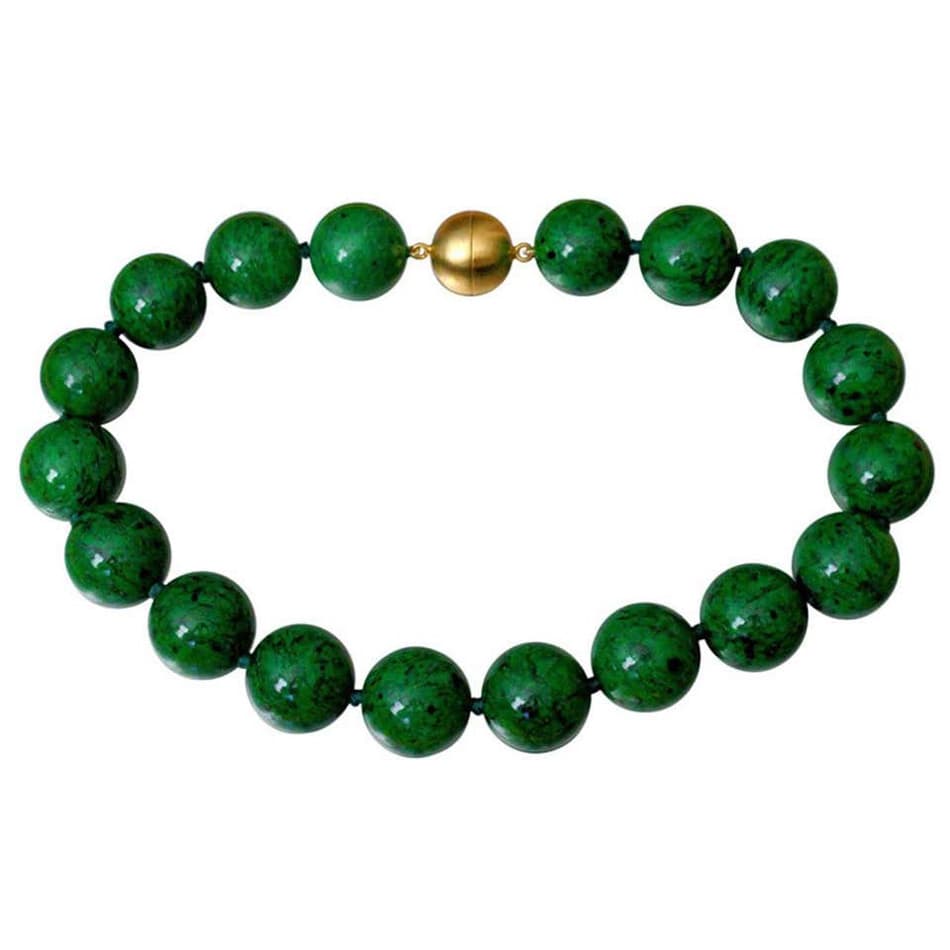 “It’s a bright green gemstone which is often confused with jade and found in Burma,” Rush explains. “The color is even better than malachite, and the stone is
