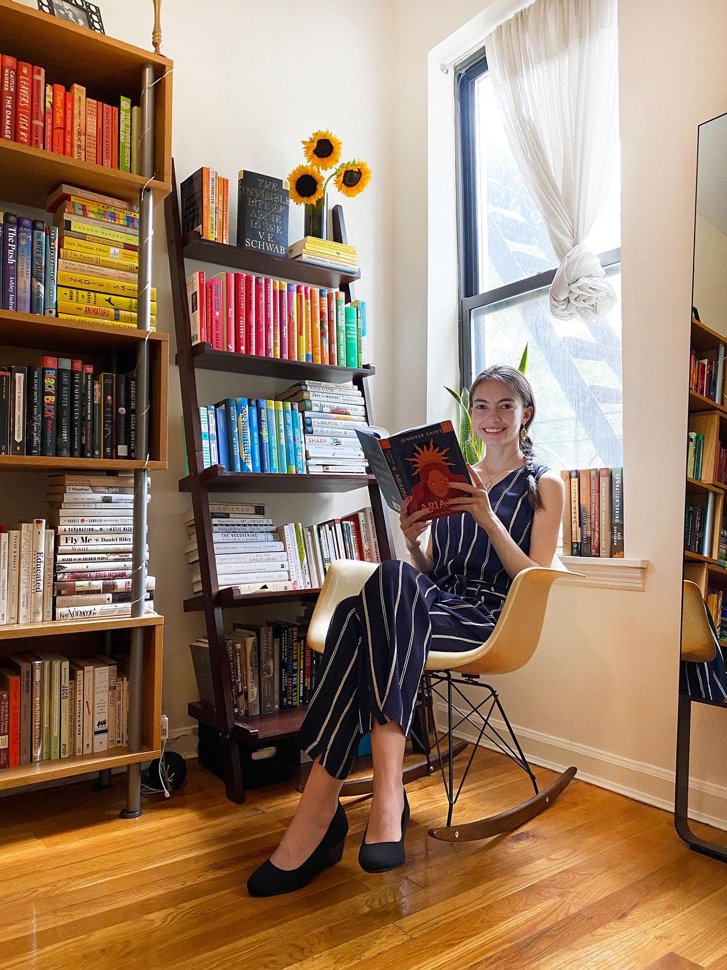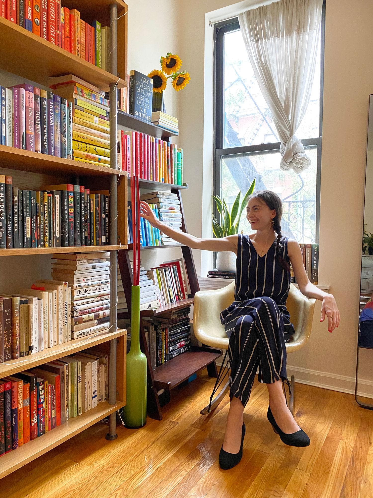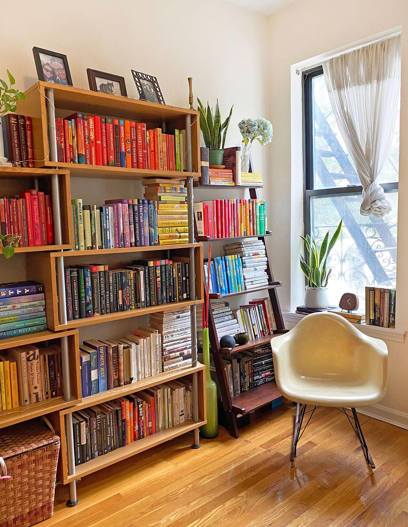"I've always wanted to live in a home that has a library with floor to ceiling bookshelves. (Unsurprisingly, I was really obsessed with Beauty and the Beast as a kid.) I live in a New York City apartment so a full-sized library is not exactly attainable, but I like to think of my book nook as a small version of that! I read here every morning before I let myself check email on my phone. This routine has become even more essential to me—and many of our members at Book of the Month—in the past year. Unfortunately, my cats also consider the nook to be the best spot in the apartment, so I'm constantly negotiating with them to give up the chair.