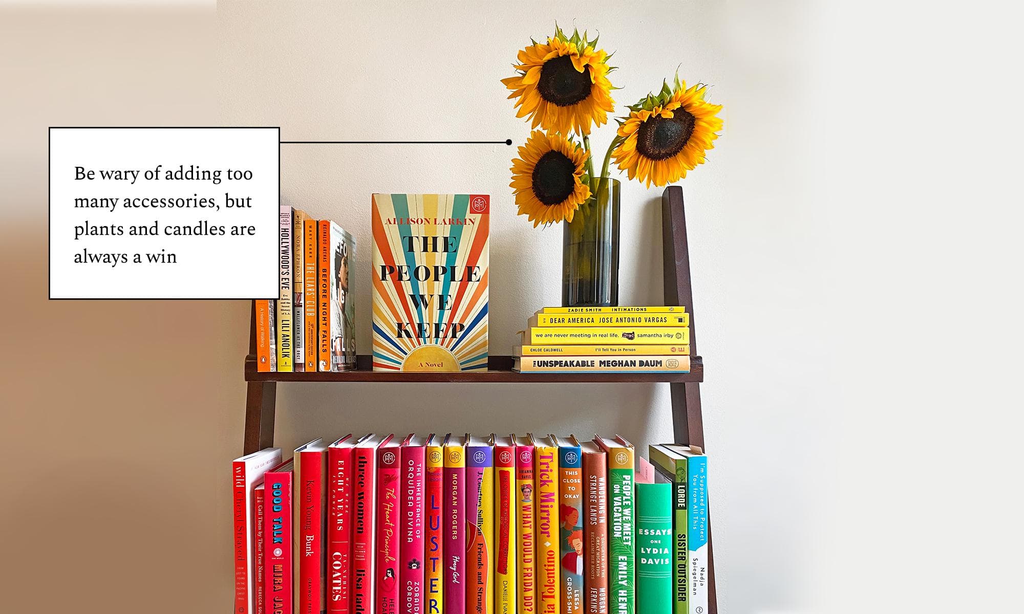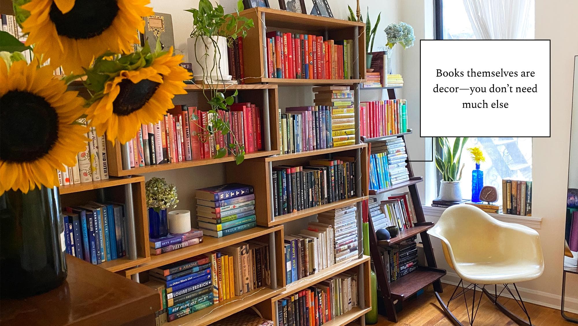 "For me, plants and fresh flowers break things up visually, and since they are living they don't feel like clutter. I'm also a fan of candles if they come in a nice jar that fits in with my decor style and there's not a distracting label on the side. But honestly I try not to keep too many small items on the shelves, because it makes dusting an even more horrible chore than it already is. Plus, I think that books themselves—particularly hardcovers—are beautiful decor pieces. I don't need much else! I only keep books that I've yet to read or that I've already read, loved, and know I'll want to return to again. I also keep books that have notes in them from when I was younger—it's fun (and often embarrassing) to go back and see what I was thinking about and underlining years ago. I don't buy books solely for their appearance; I only have so much shelf space, so if it's not truly going on the TBR (to be read) list, it can't stay!"
