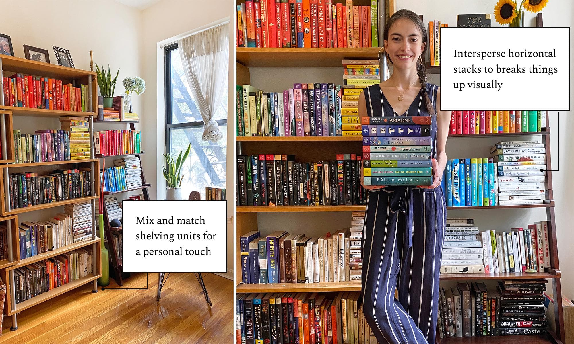 "Many book people I know will find this blasphemous, but I've been arranging my books by color for years. I have a visual memory, so I'll often remember the color of a book's spine before I remember the title. It also serves a practical purpose—because of my job at Book of the Month, which involves lots of reading to source the best recommendations for our members, new books are always cycling in and out of my apartment. If I tried to sort them all alphabetically I'd end up rearranging constantly! I don't pay too much attention to spine height when arranging my books. My Book of the Month books are all the same height, so that makes things easy! I do intersperse horizontal stacks though because I like how it breaks things up visually, but also because they serve as bookends for the shelves that don't have any siding. Horizontal stacks also allow me to fit more books on the shelf since I can never turn down a new book!"