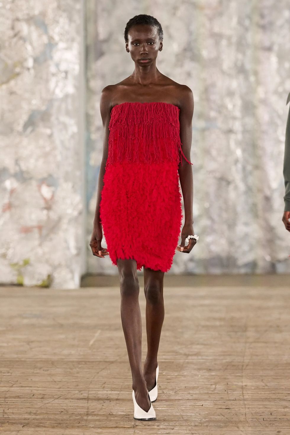 Take, for example, the fire engine red draped slip dress that Pierpaolo Picciolo sent down the Balenciaga runway for his Spring/Summer 2026 debut, complete with a half, cape across one shoulder to dress things up a little. Or the series of crimson mini dresses seen at Diotima, Loewe, and Givenchy, where texture gave them a point of difference with fringe and leather.