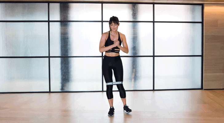 “Loop the booty band around your ankles (as shown). Stand with your feet together, upper body bent slightly forward at the hips. Step out to the left, then back to the right. Try to drag your toe on the floor as you move from side to side. Do 20 steps back and forth in each direction, three times, and that should set that bad boy on fire.”