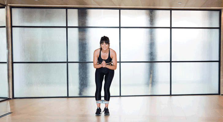 “Loop the band above your knees and stand tall. Step your right foot diagonally behind you, lowering your right knee until it almost touches the ground. Return to start and repeat on the opposite side for one rep. Do three sets of 15 reps.”