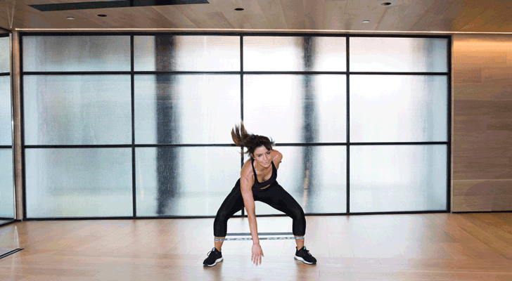 “Start with a booty band around your ankles and feet together, jump out into a squat, and touch the ground with your right hand. Repeat again and alternate hands for a total of 15-20 reps.”