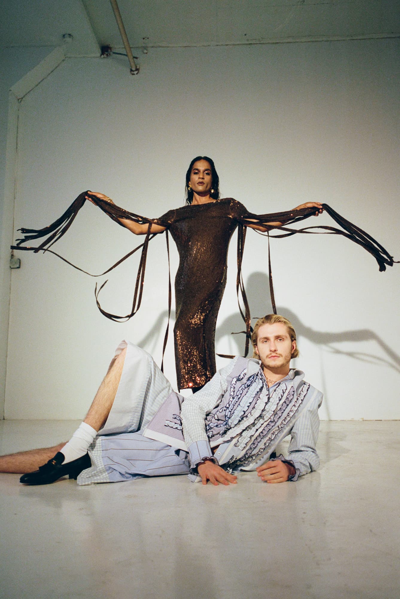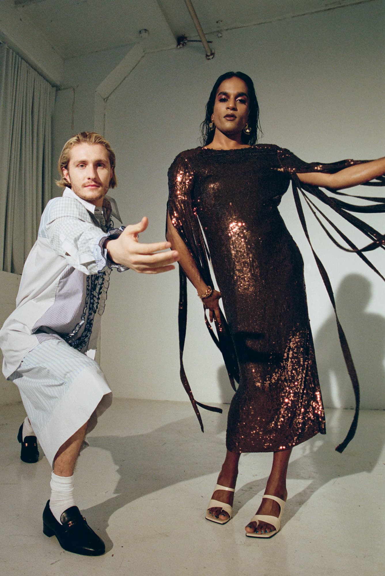 Photo assistant: Emerald Layne; Stylist assistant: Rashonna Duett; Richie wears Valentino dress, Reike Nen shoes, Sara Robertson earrings, Dior bracelet, Young Frankk bracelet, Full Louis Vuitton look, Louis Vuitton shoes, and Dior earrings; Ben wears Christopher John Rogers two-piece, Gucci loafers, Another Feather necklace, The Break Vintage turtleneck, Dior pants, and Maryam Nassir Zadeh sandals.