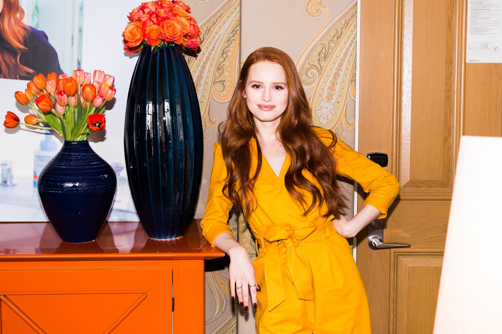 The first thing I notice when we arrive at our shoot with Madelaine Petsch? Her face, which is plastered everywhere lately while she promotes her recent partnership with Bioré. It’s a move that could easily be considered very “Cheryl Blossom”—aka the queen-bee-type character that Petsch plays on Riverdale—but the actress quickly proves she’s nothing like her on-screen alter ego. Where Cheryl can be dramatic and downright mean, Madelaine is laid-back and friendly, cracking joke after joke as her photo is taken. Her brand of humor is sarcasm (but not the rude kind), and when it comes time to talk, I feel as if we’re old friends.
