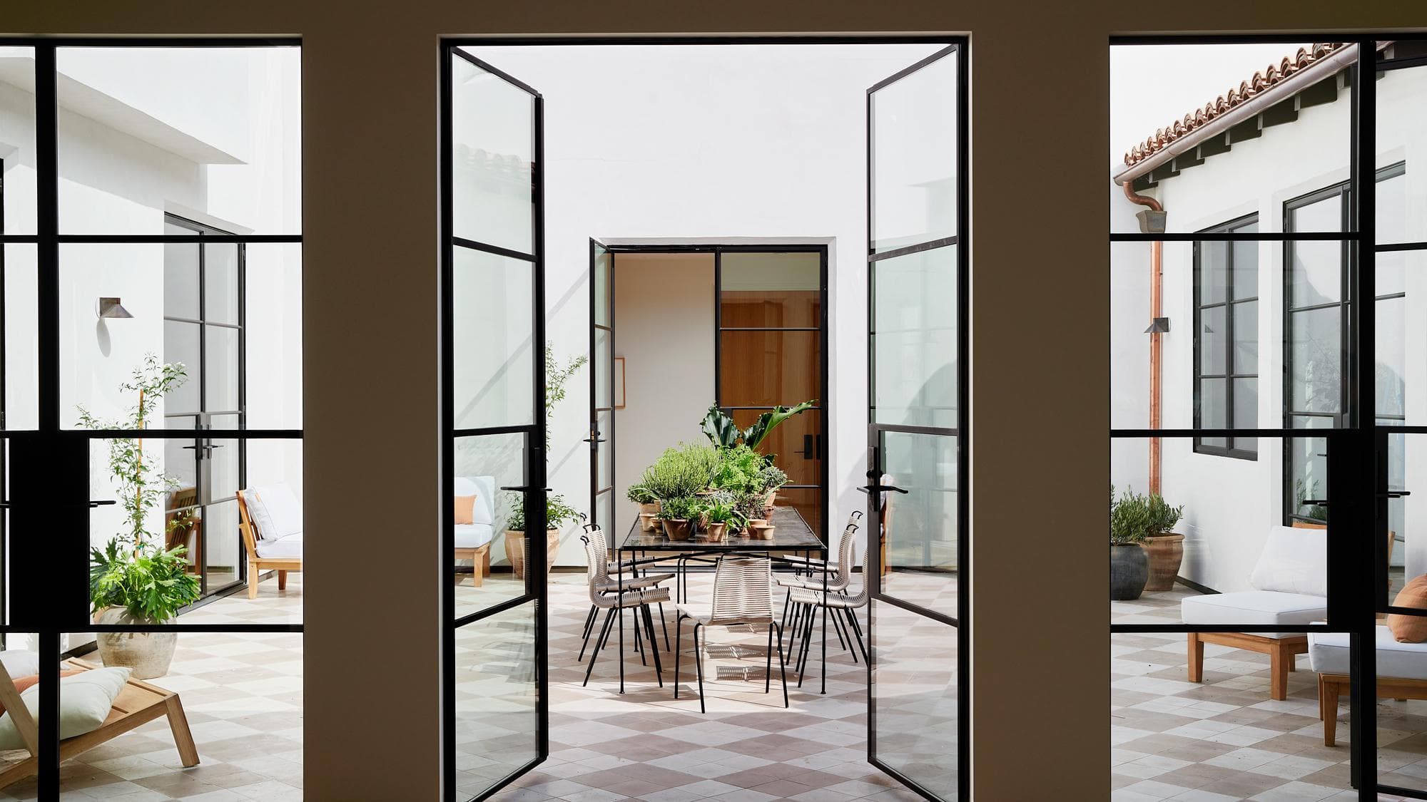 While the Novogratz prefer to leave original structures intact, a bad case of spoiled soil forced them to tear it down and restart. The challenge then became rebuilding the home while paying homage to its original facade. Despite this seemingly tragic loss, Robert’s favorite aspect of the home prevailed—the interior courtyard. A rarity for houses in America, the Spanish style architecture encircles a tile-clad nook of a courtyard, bordered by steel and glass doors that allow the home’s dwellers to blur the lines between outdoors and in.