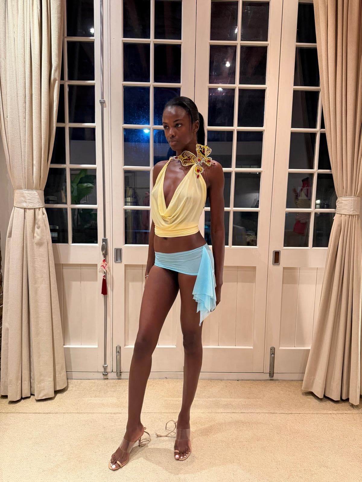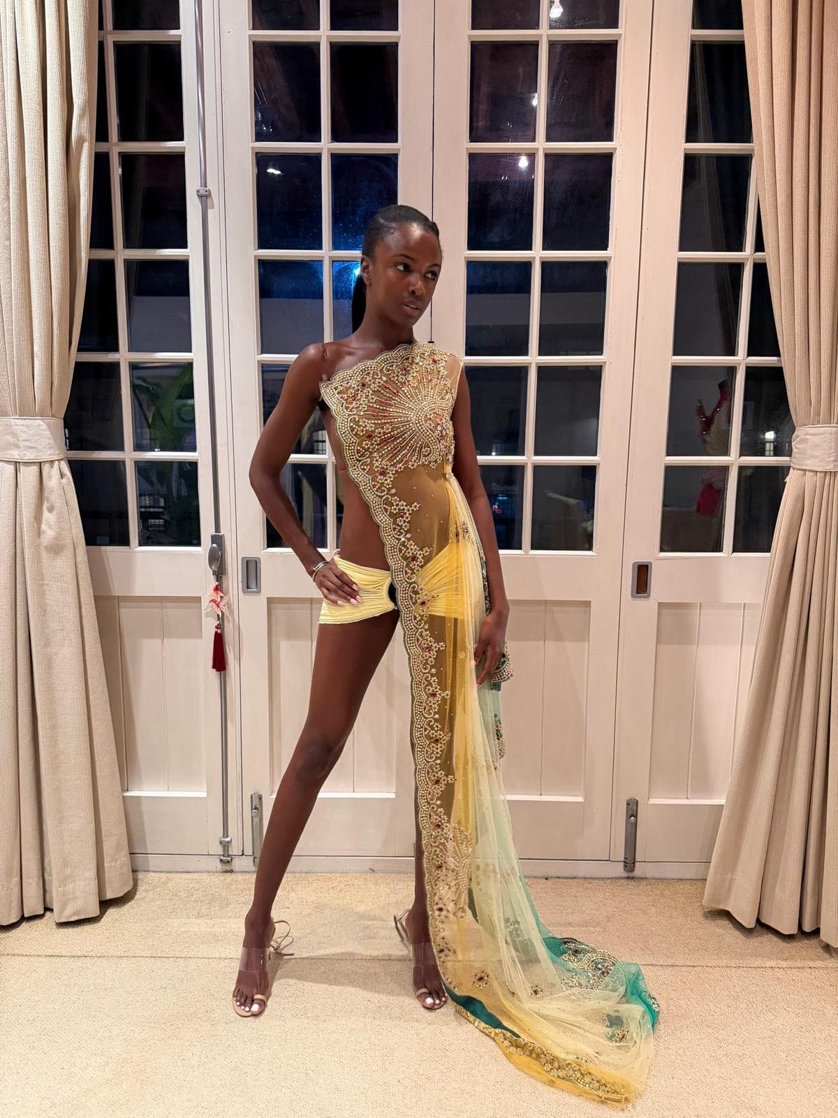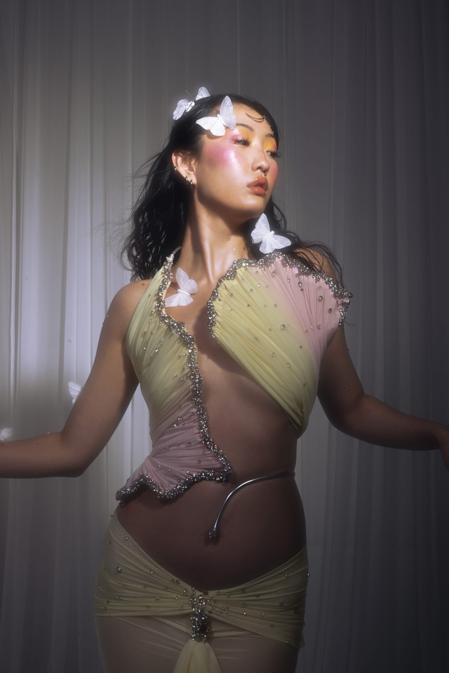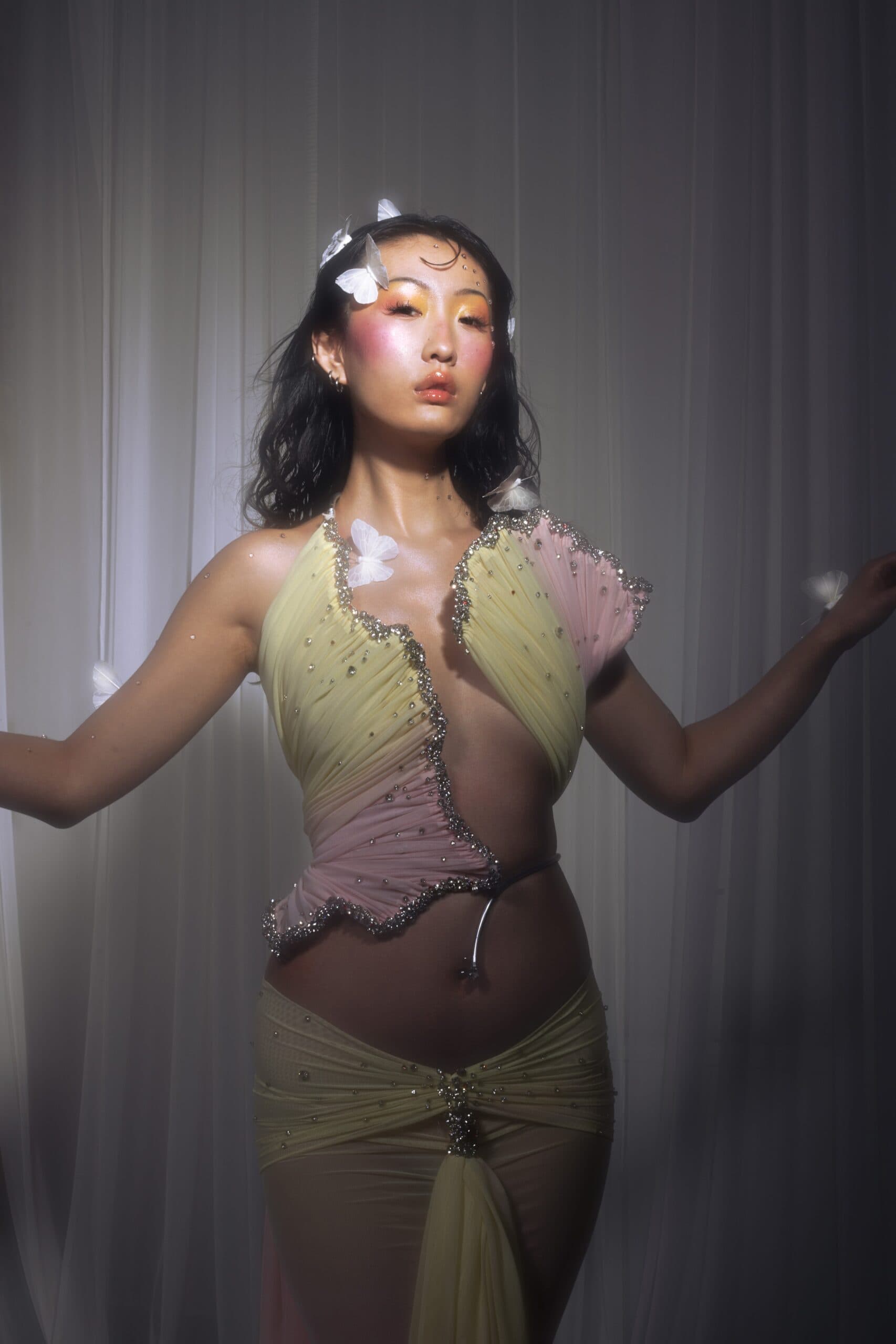 "I balance fantasy and wearability by starting with the body. I gravitate toward fluid, body-hugging silhouettes and sheer, soft fabrics that move with the wearer. Even when a piece feels otherworldly, I always imagine myself wearing it walking into a room, moving, breathing, existing in it. For me, fantasy doesn’t mean restriction. I want the garments to feel alive, to have their own movement and moments, so the person wearing them can experience that sense of extravagance in a very real, physical way."
