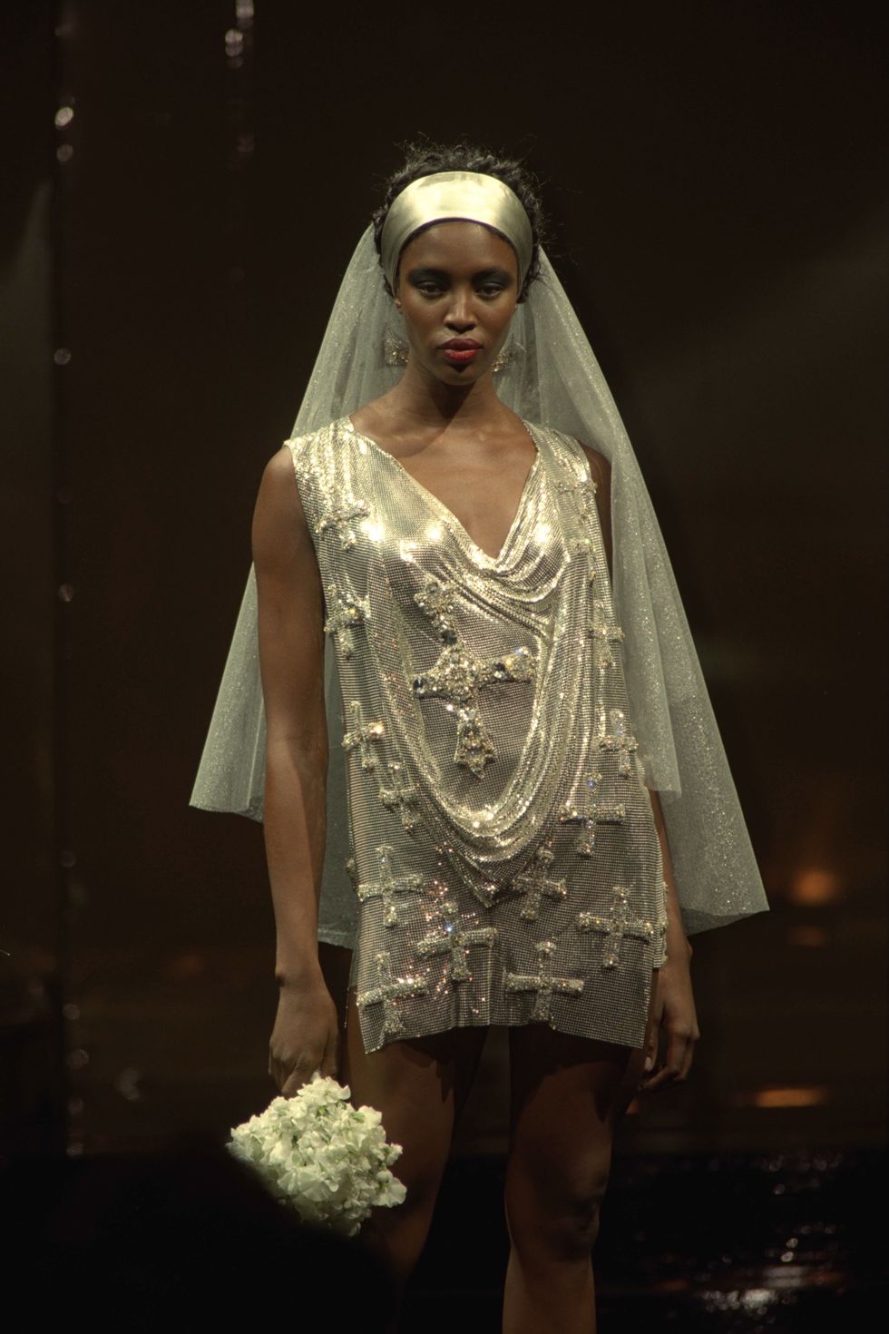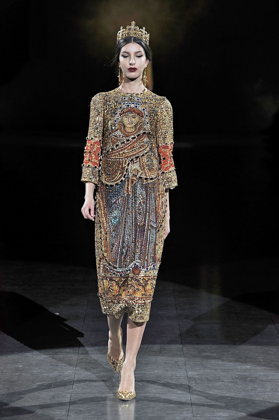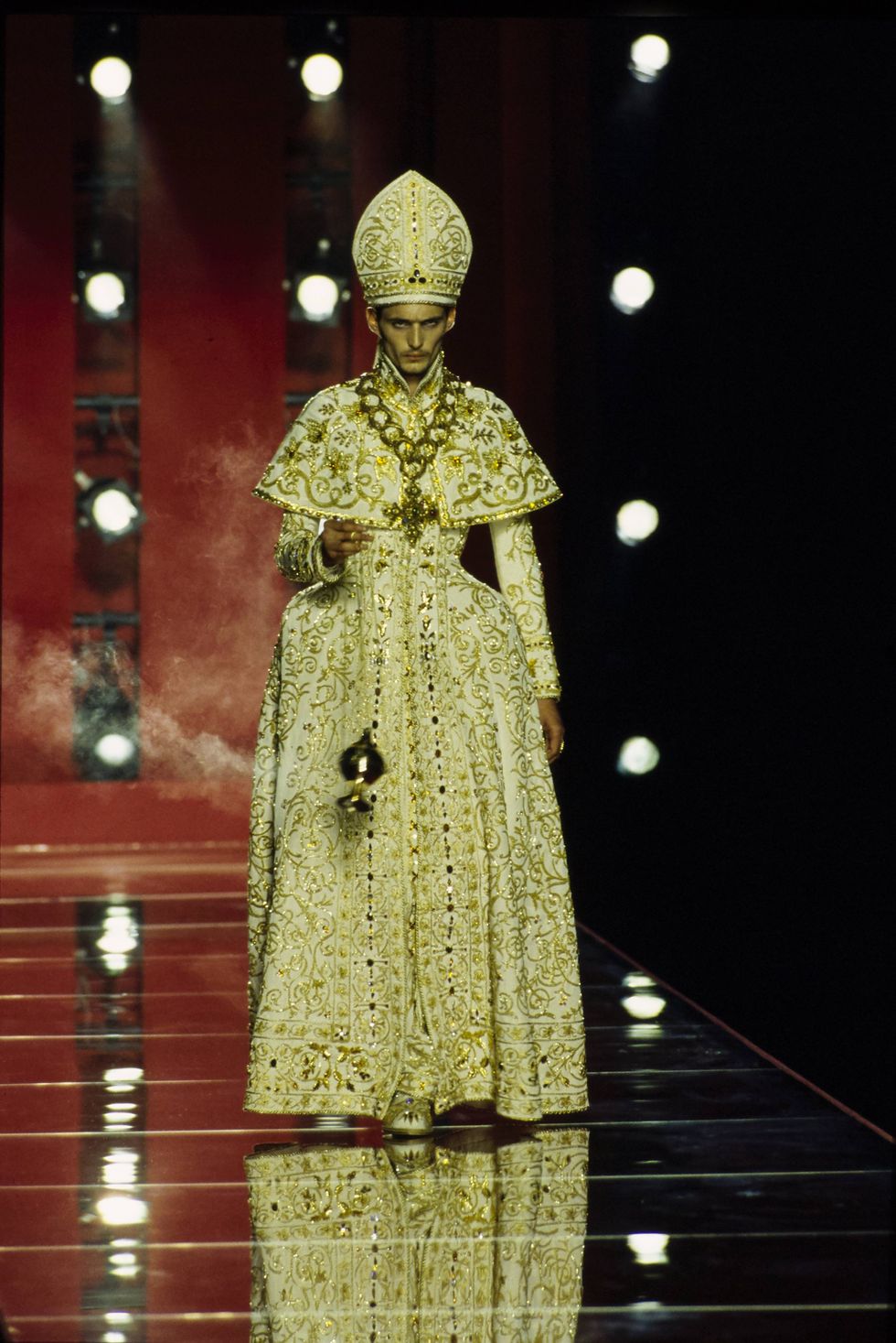John Galliano was another designer who used religion to explore the role of costume and identity in design. Specifically, his Fall 2000 Haute Couture collection for Christian Dior, where he sent a model down the runway wearing a Catholic priest costume, which was later acquired for The Met’s 2018 exhibition, Heavenly Bodies: Fashion and the Catholic Imagination. Then there are the Italians, like Gianni Versace and Domenico Dolce & Stefano Gabbana. The former showed a final collection just a week before his death, featuring pieces inspired by the mosaics at cathedrals and glo-mesh gowns with crosses embellished onto them. The latter were similarly inspired by Byzantine and Venetian mosaics for their Fall 2013 show.
