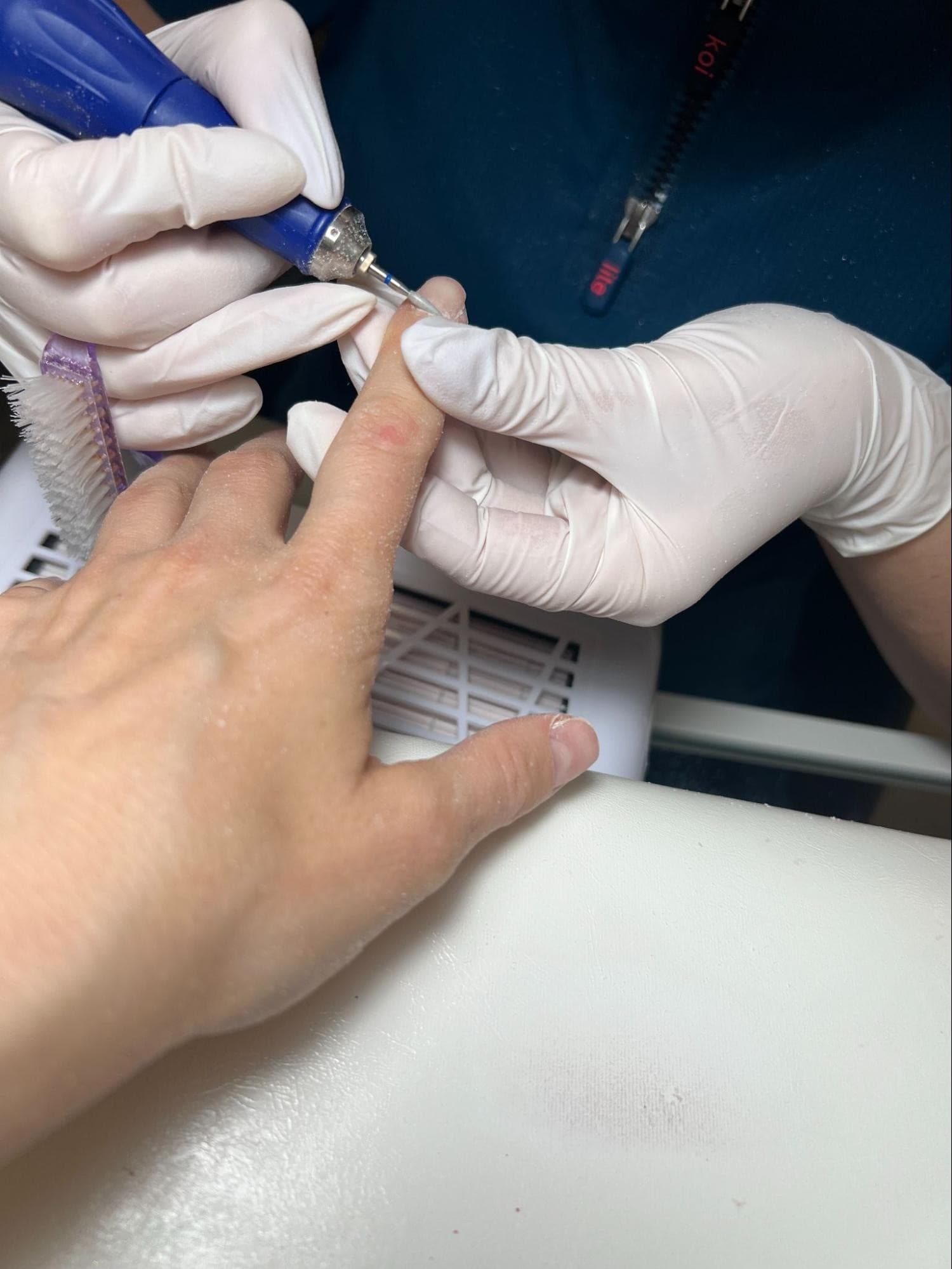 Next, Kovaleva used scissors to clean up my cuticles before removing the skin around and underneath my cuticles with another drill bit. Throughout this process, Kovaleva used a brush to buff my nails. After Kovaleva filed my nails the way I like them—short and square—it was time to add a rubber gel base. (This is what gives the Russian manicure the incredibly smooth finish it’s known for.) The shorter the nails, the harder the base material should be, explains Kovaleva.
