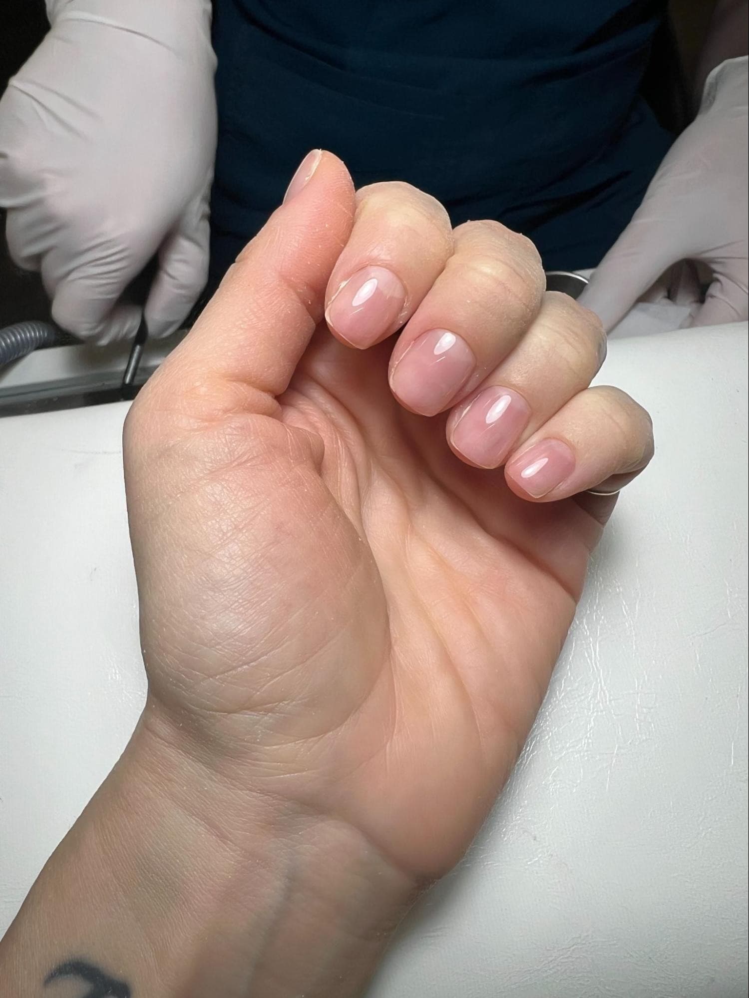 The final result.Kovaleva cleaned my nails with an alcohol wipe and got to work. While she applied the rubber base on each nail, I placed my hand underneath the UV gel lamp a total of 10 times—one time for each nail. To be honest, it didn’t feel entirely comfortable. I unexpectedly winced in pain during this process, but Kovaleva assured me that sensation was normal and it simply meant that the rubber base was hardening.