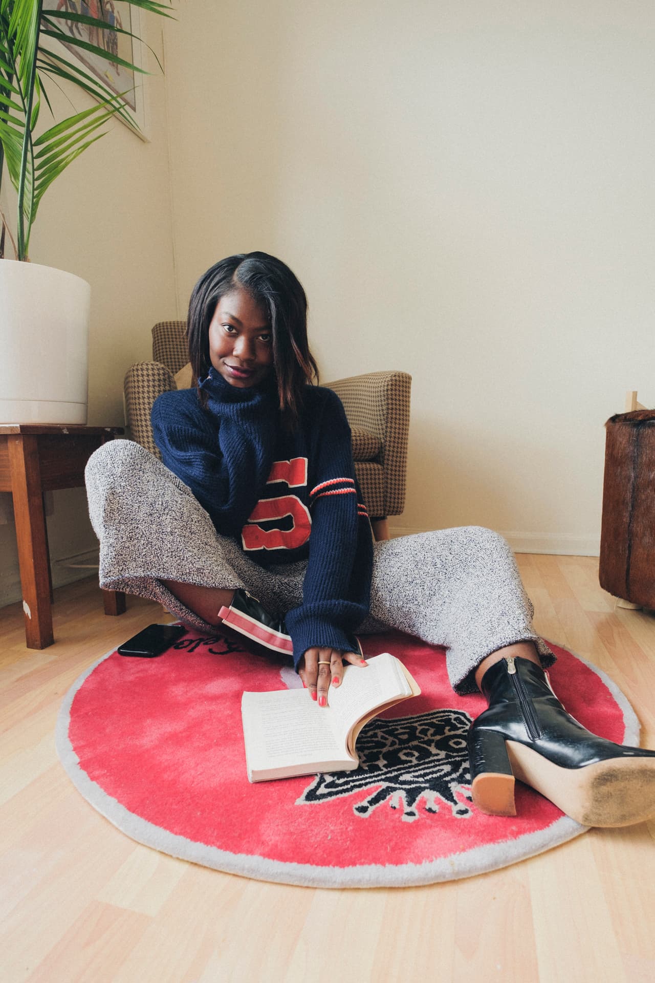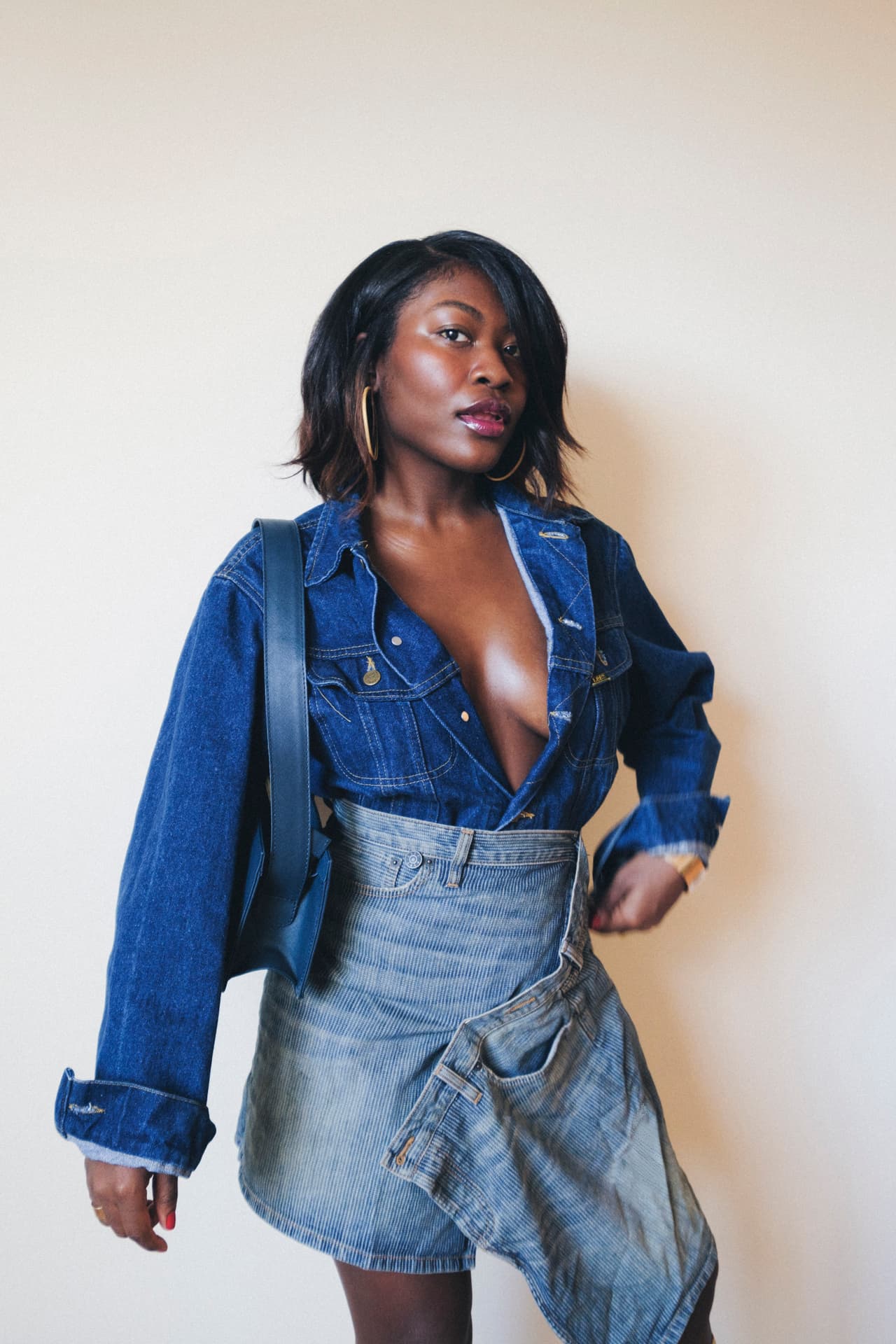 e, black ’90s Nine West leather boots, a simple hoop (large or small), and a blue-and-white pinstripe men’s button-up.”