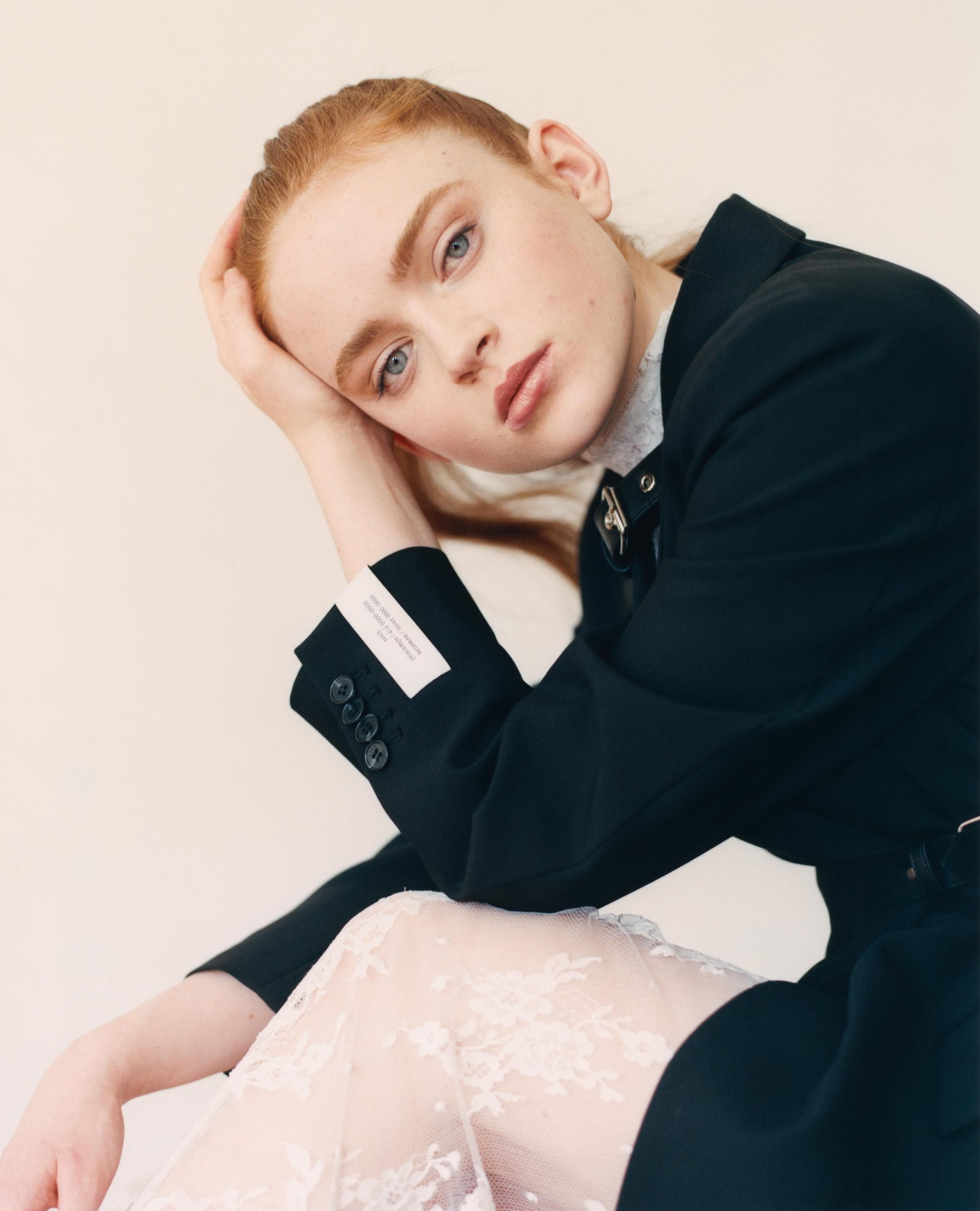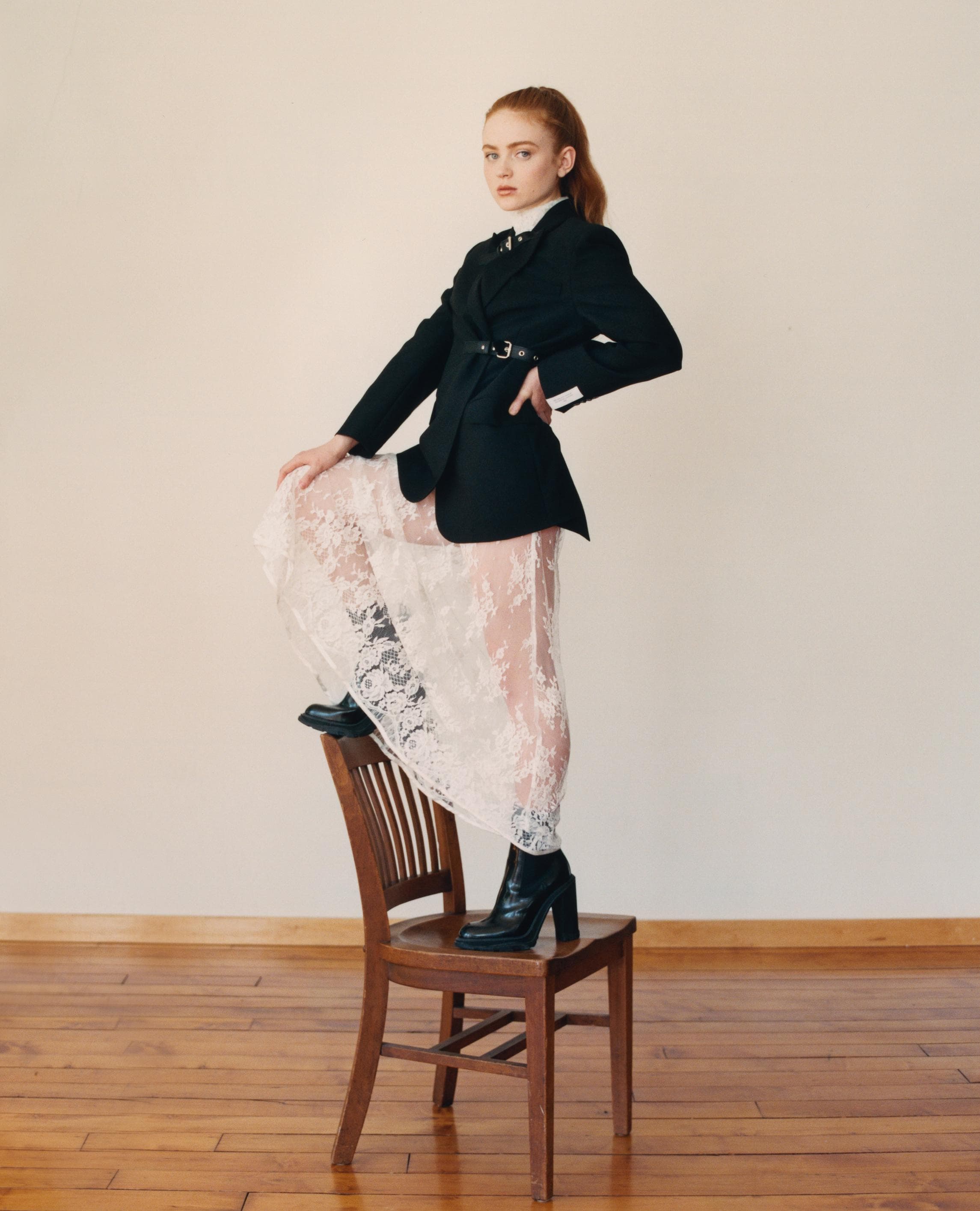 Dress: Rodarte; Blazer: ROKH; Boots: McQueen; Underpinning: WolfordFor a “theater kid” from small-town Texas, it’s a robust resume—one to which she can now also add “expert sartorialist.” While style isn’t always top of mind during Sink’s puppy-playing days off at her parents’ home in Summit, New Jersey, her post-modernist style (often showcased on the press circuit) still graces many mood boards. The founder of one popular fan page created a Sink-dedicated feed, @stylesofsadie, and accrued a 10,000-strong followership by chronicling the actress’s outfits.