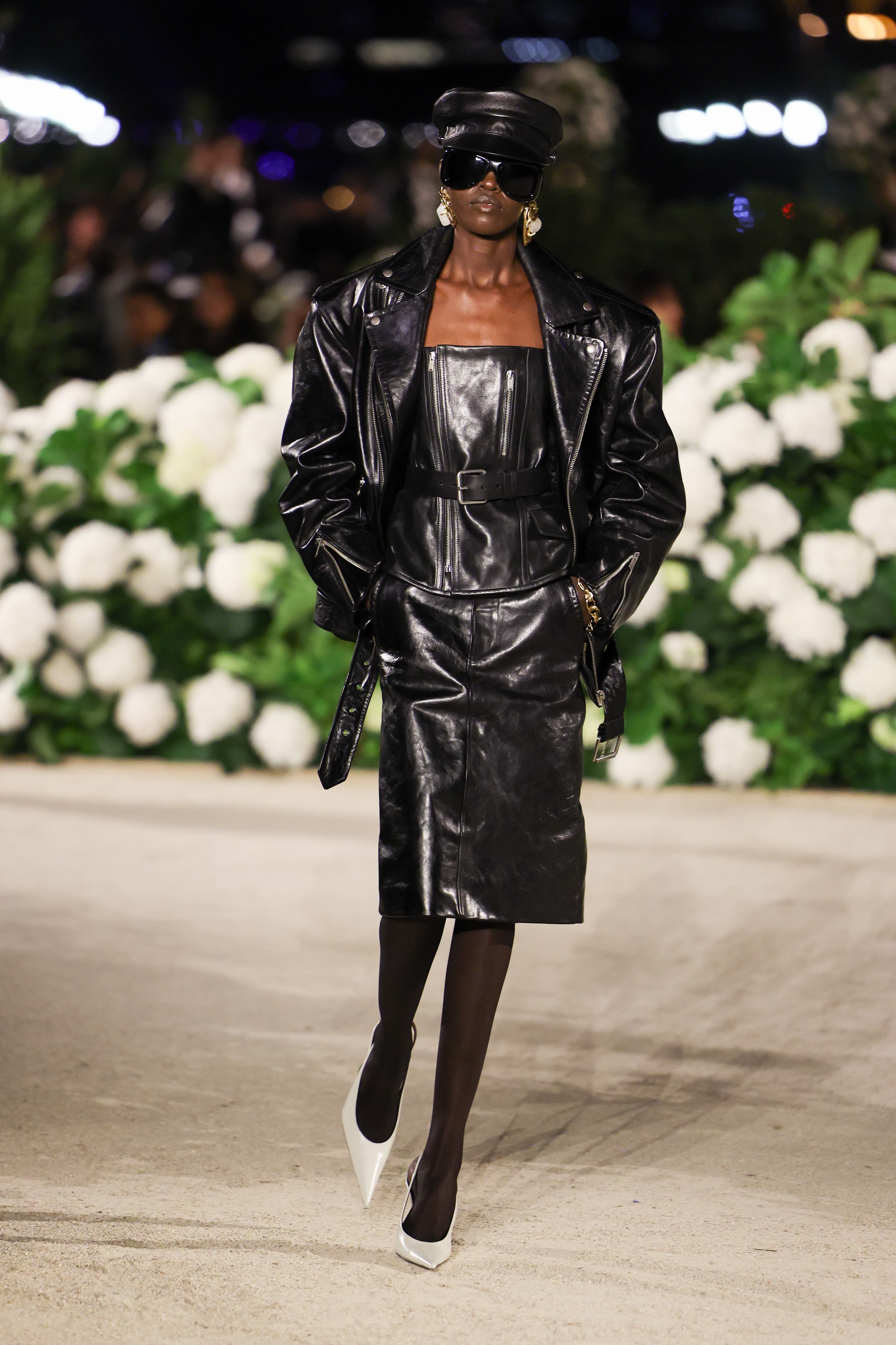 For Anthony Vaccarello's Spring Summer 2026 collection for the house, this was the starting point for the collection, alongside a surplus of leather. There were leather bombers layered over pencil skirts and silk blouses with oversized pussy bows—an accent Vaccarello has experimented with previously—paired with dagger-point sling backs and great big "Like A Prayer" era gold cross earrings that dripped with pearls. Leather military caps took Vaccarello back to referencing Mapplethorpe and gay cruising which felt pleasantly subversive given the state of things.