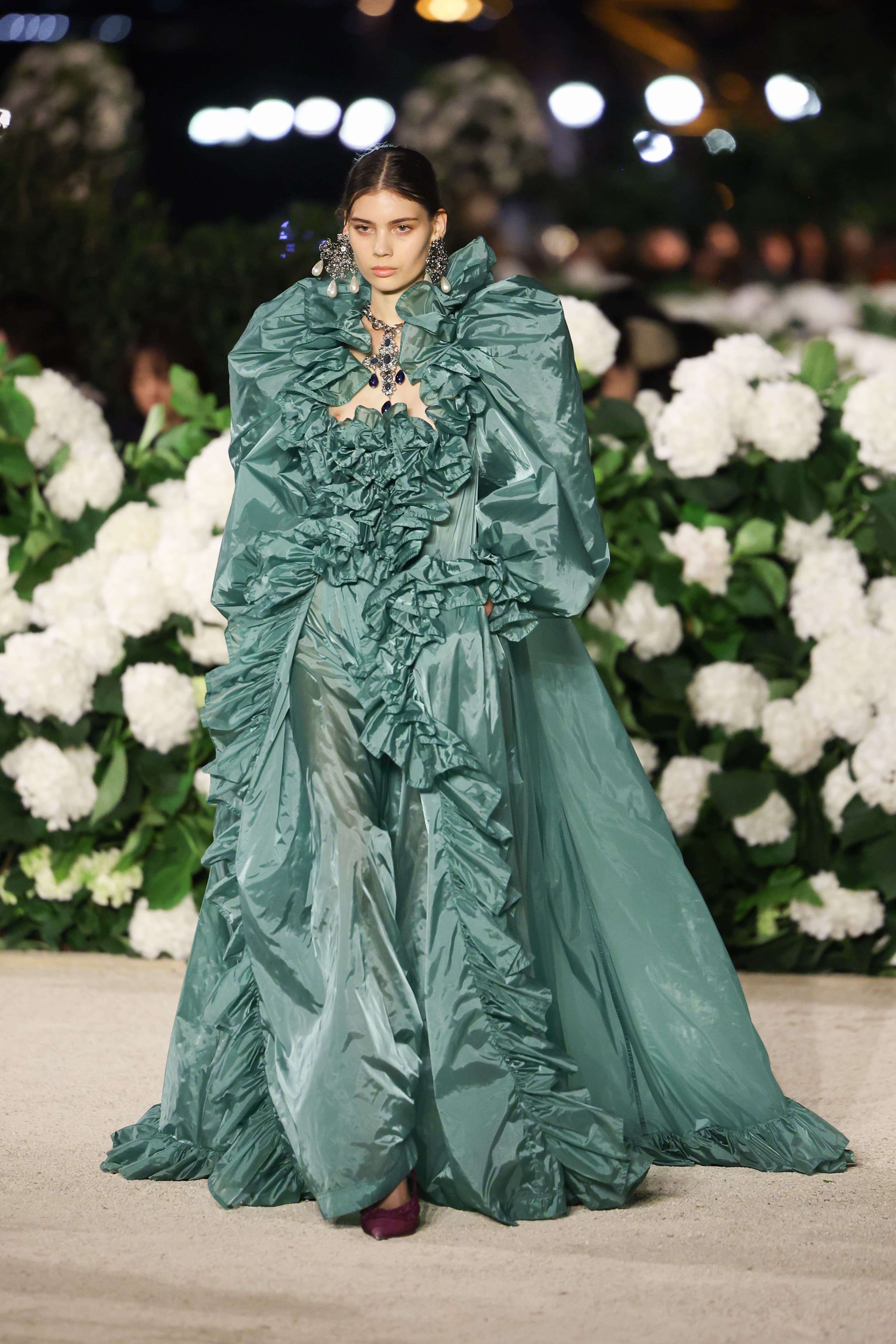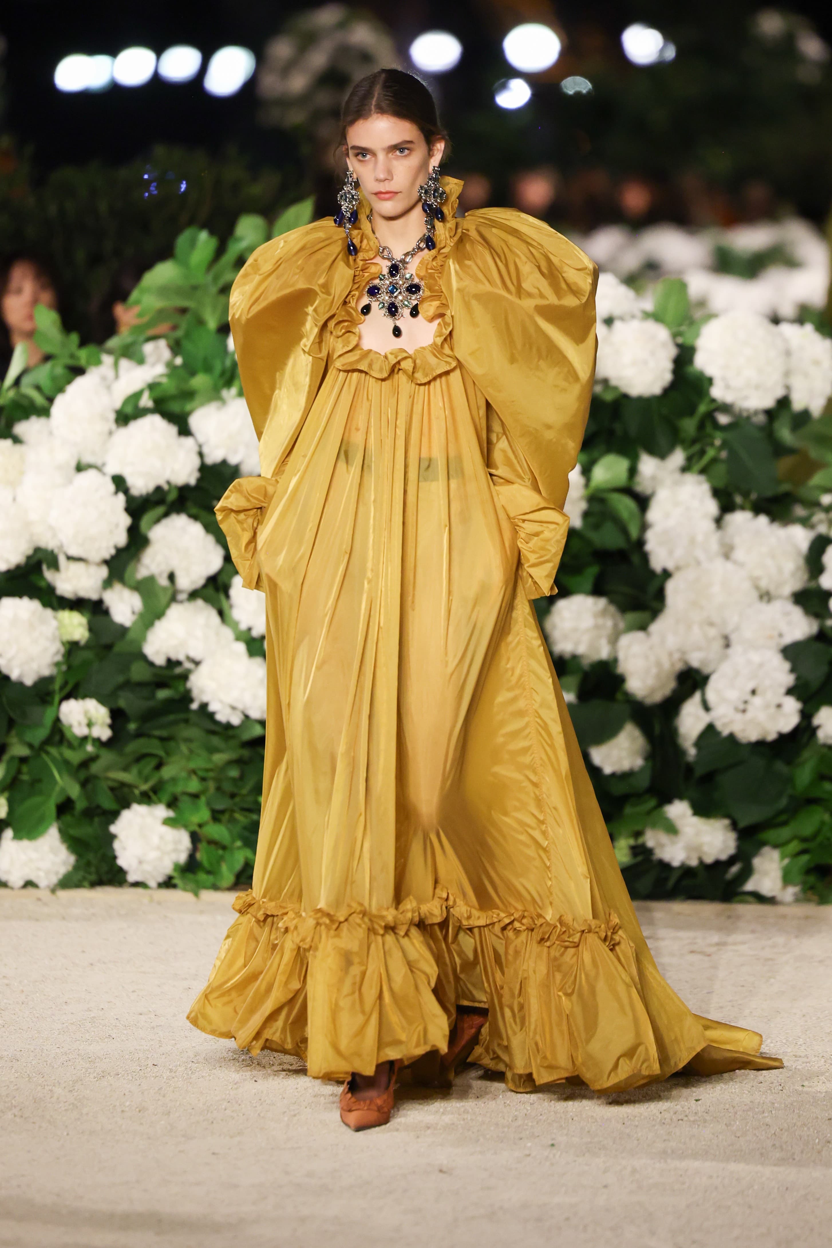 Getty ImagesSee also: a procession of slippery nylon looks. Trench coats and dresses with Vaccarello's growlingly signature oversized shoulders in shiny clingy nylon that felt almost organza-like with the way it moved. These were followed by evening gowns in the same material which floated like water and featured great big skirts and ruffles and puffed sleeves that felt both Rococo-esque and slightly Italian glamoured. Instead of panniers and crinolines Vaccarello left little to the imagination underneath the sheer garments.