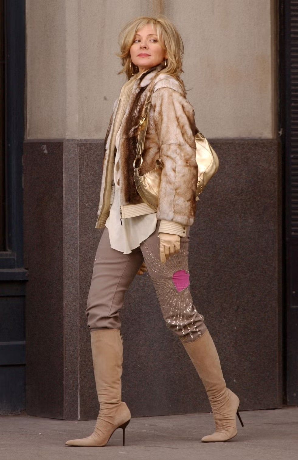 Maximalism done right in her casual 2000s phase. She always loved a gold bag (who remembers the fake Fendi debacle?)