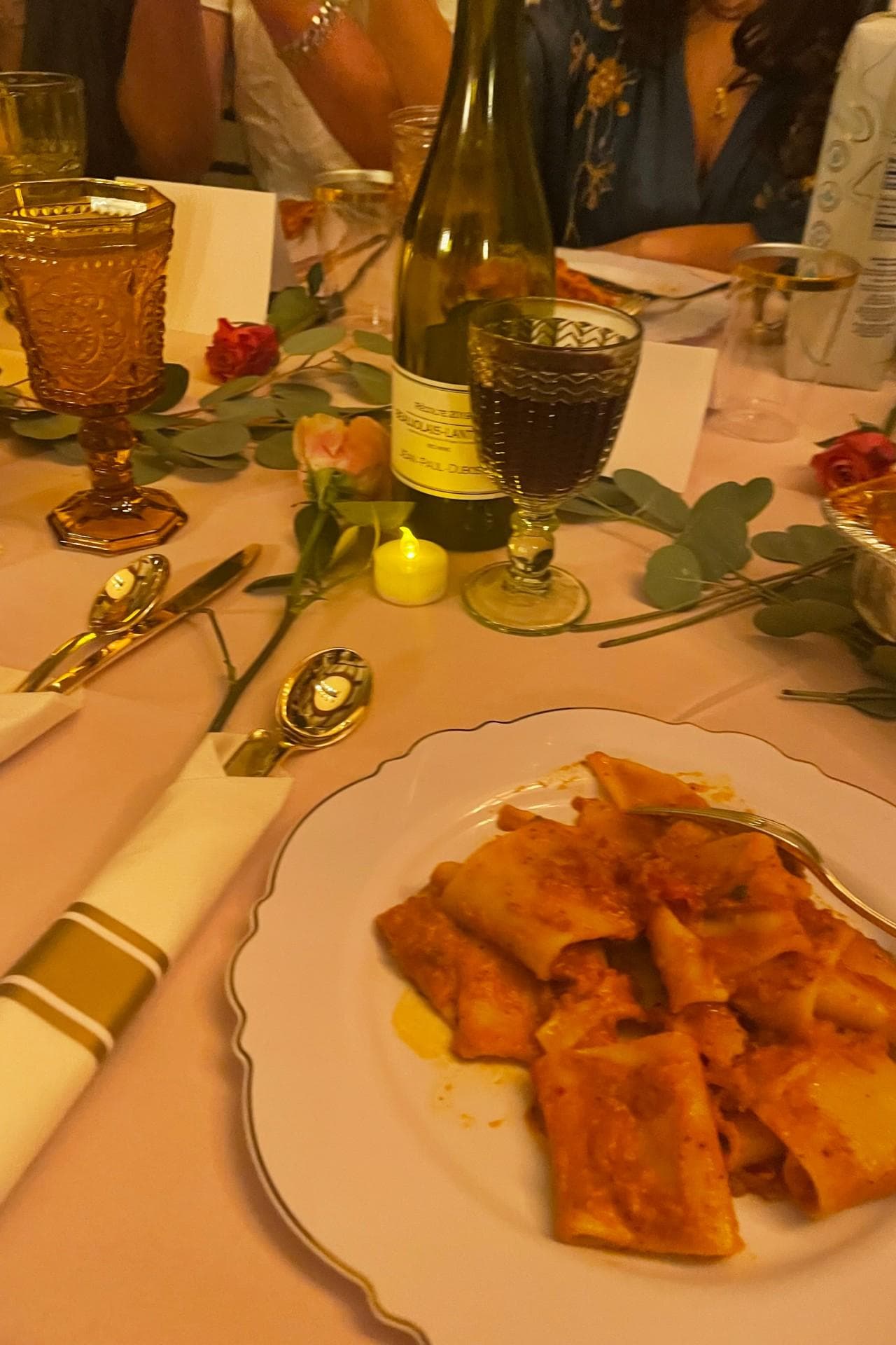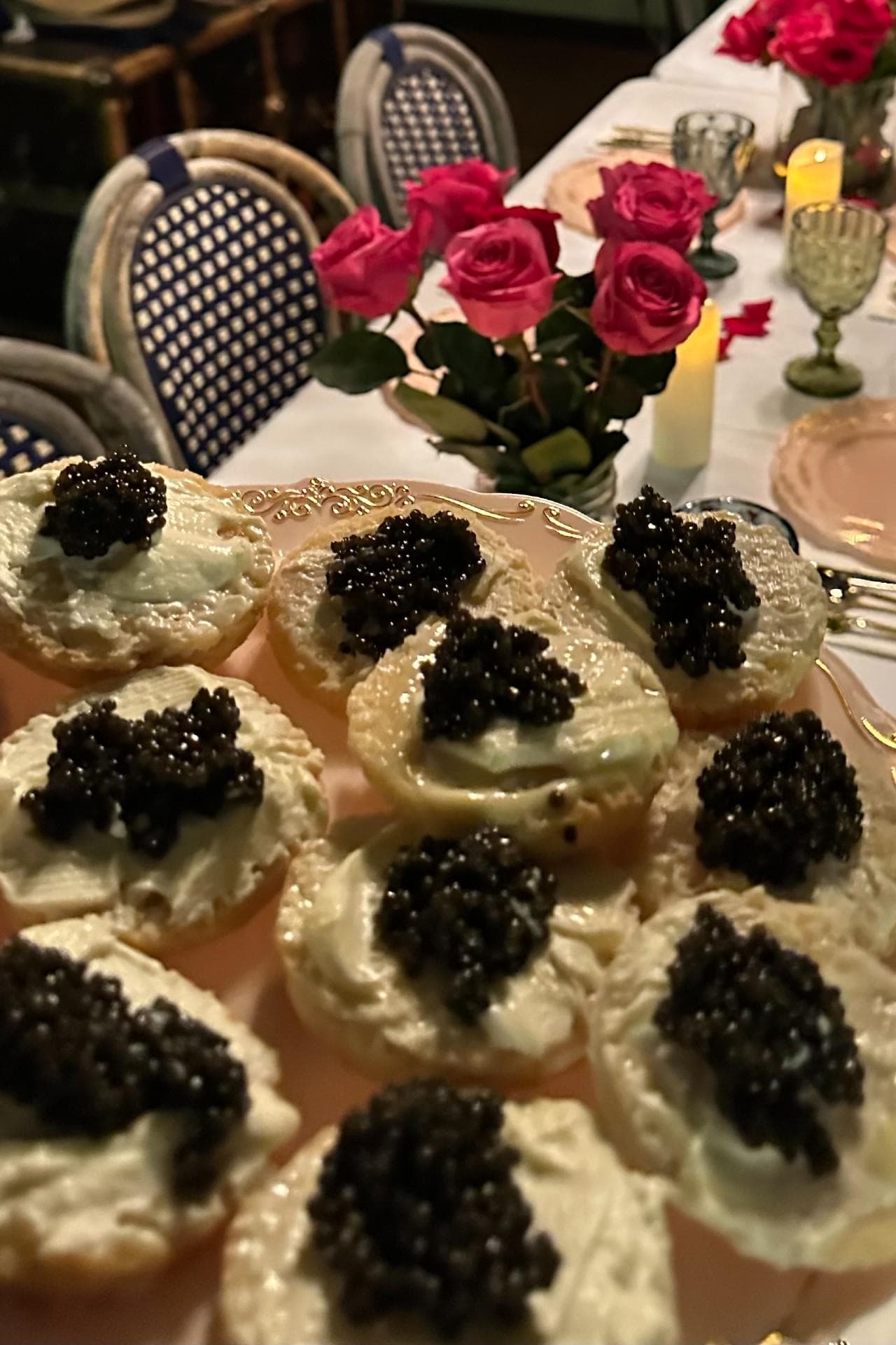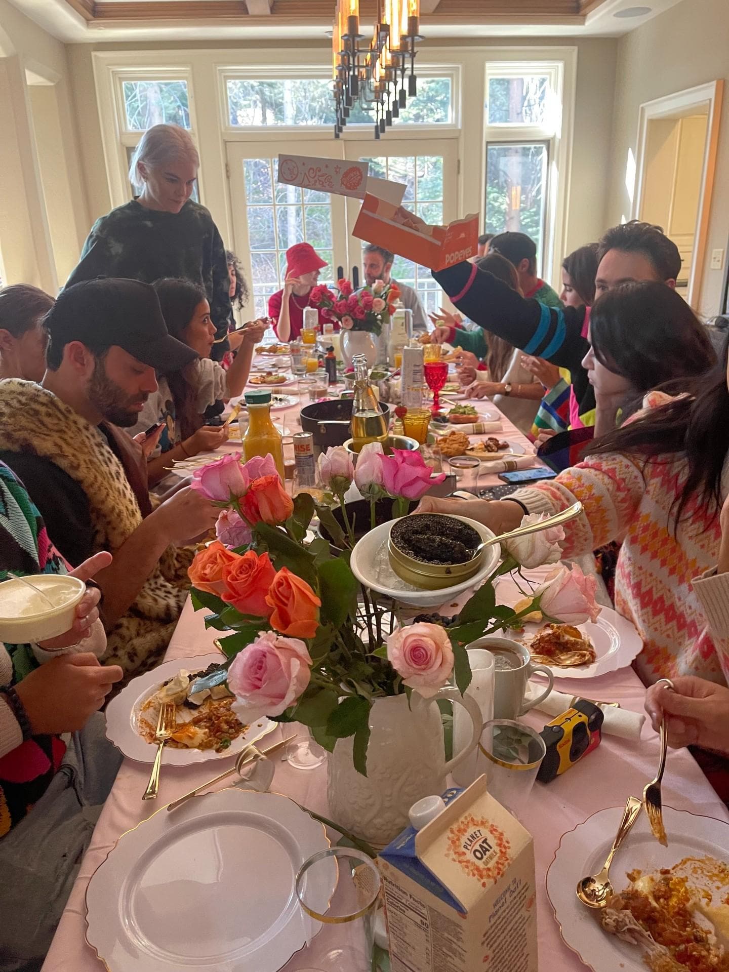 “I did one for my birthday a few nights ago. We rented a cabin in Topanga. I had white tablecloths [across] two tables. It was a 14-person party and I got a bunch of candle holders and candles and then vintage vases and just stacks of roses going down—red roses. Then I had these pink plates with gold edges. For the appetizer, we had Popeye's biscuits with crème fraîche and royal Oscietra caviar and that was incredible. Then, lots of champagne and I always set up a bar on the side so everyone can just go and make their cocktails. Then for the main, I have a spicy vodka sauce that all my friends are obsessed with. I make it once or twice a year.We had that with paccheri pasta. We indulged. And then there's more wine. Sometimes we get a little crazy, whip out the mezcal—the Casa Azul. We all hang out in the living room after. “
