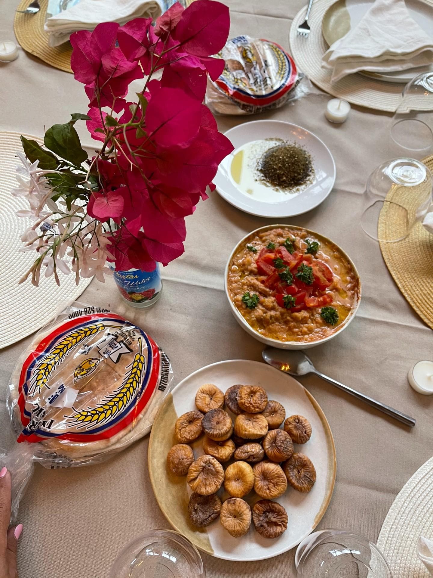 “I like decadence. I'm just a big fan of indulgent spreads. Being Palestinian, we grew up with just so much food and my mom's cooking all over the table. Food is her love language, which was passed down to me. So, when we invite people over, it's just so extra. There are so many plates of so many different things. Nothing makes us happier than having everyone just enjoying themselves and eating. For me, I like crystal glassware with hummus inside. I like vintage, antique pieces. I like having the napkin holder be maybe silver or gold and with pearls on it. That kind of vibe."