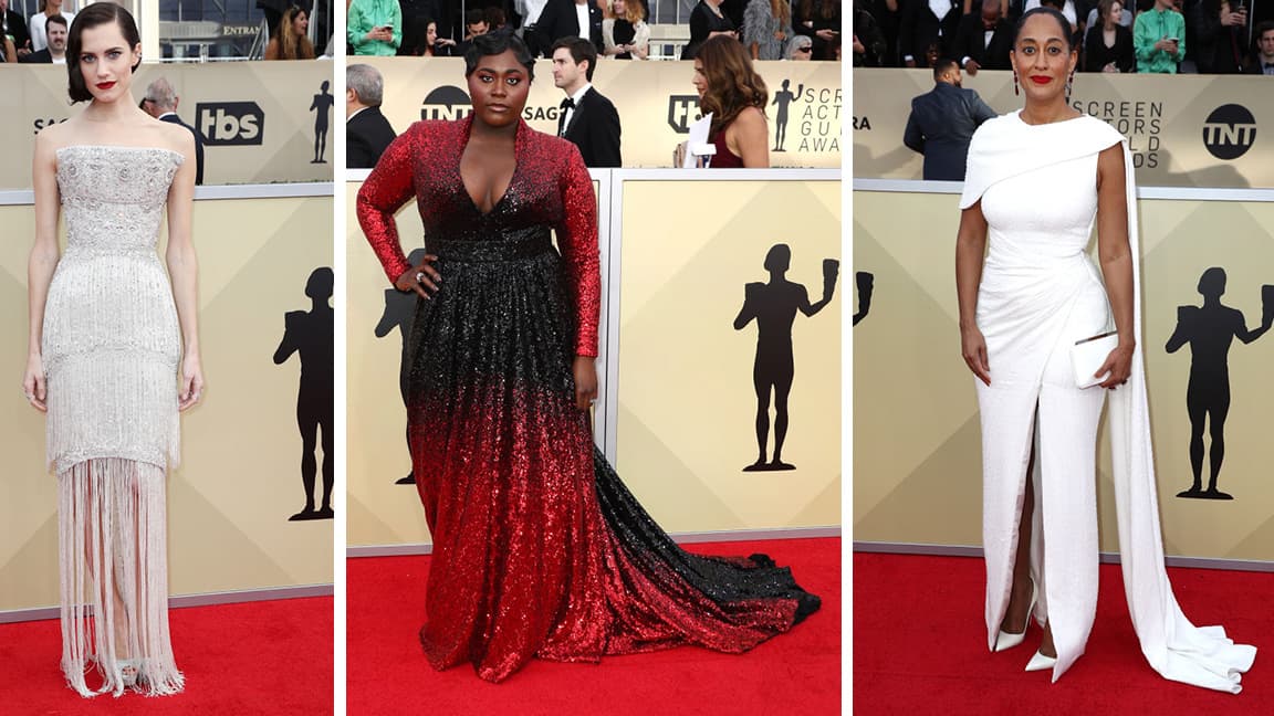 The 24th Annual Screen Actors Guild Awards aired on Sunday night, with celebrities from Natalia Dyer and Millie Bobby Brown to Tracee Ellis Ross and Allison Williams turning out for the festivities. While the the blackout fashion at the Golden Globes two weeks ago called attention to the Time’s Up movement, both the Critic’s Choice Awards and SAG Awards appear to have returned to the traditional glitz and glamour of the red carpet. Stars favored looks in white, cream, and pink shades, with plenty of sparkle and embellishment all around.