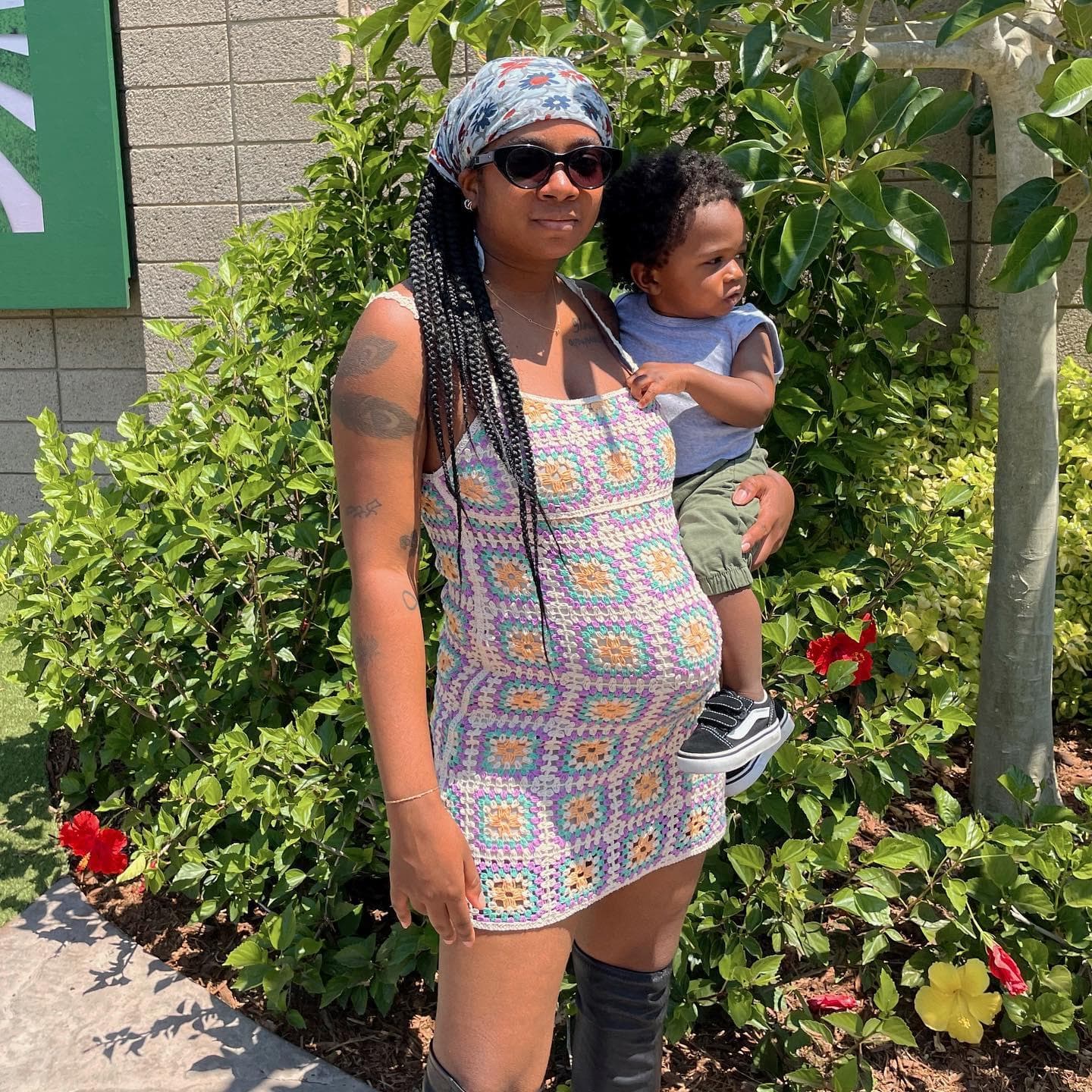 "During my first pregnancy, I went from having pretty much A-cups and never wearing a bra to having these huge mom boobs; I'm still learning about purchasing clothes that [properly fit]. But during my first pregnancy, I’d typically wear a shirt that was fitted on the top half—so you could see my huge mom boobs—and a bit looser around the stomach. That way, you could see the bump but it was breathable. I’d wear that with some comfortable sneakers and just have fun with accessories. With my daughter, since I was pregnant in between seasons, I’d go for a short dress, long boots, and a head scarf."