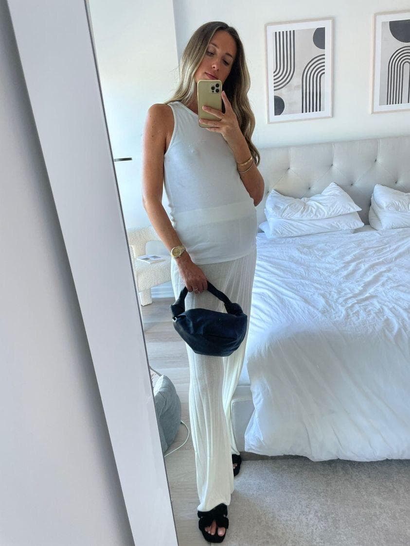 "For both pregnancies, I never bought maternity clothes. The first time around I definitely focused on buying things that were comfortable, like big sweaters and cardigans and that type of that stuff. The second time around, I just didn’t want to dress like that. I figured that if I'm going to be pregnant again, I want to feel good. I felt a lot more confident. I was just like, okay, I'm pregnant. I'll buy things in one size up. I just dressed how I would dress now with maybe a few more tight-fitting dresses, slip skirts, and slip dresses. They're flattering regardless and timeless so I knew that I wasn’t going to look back and be like, oh my God, why was I in that oversized sweater every day?"