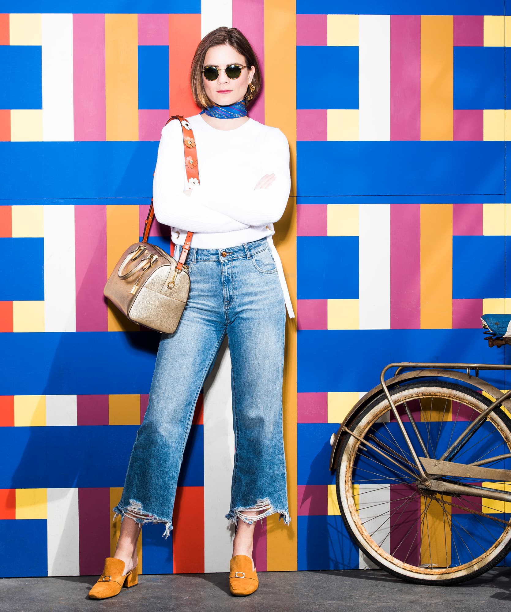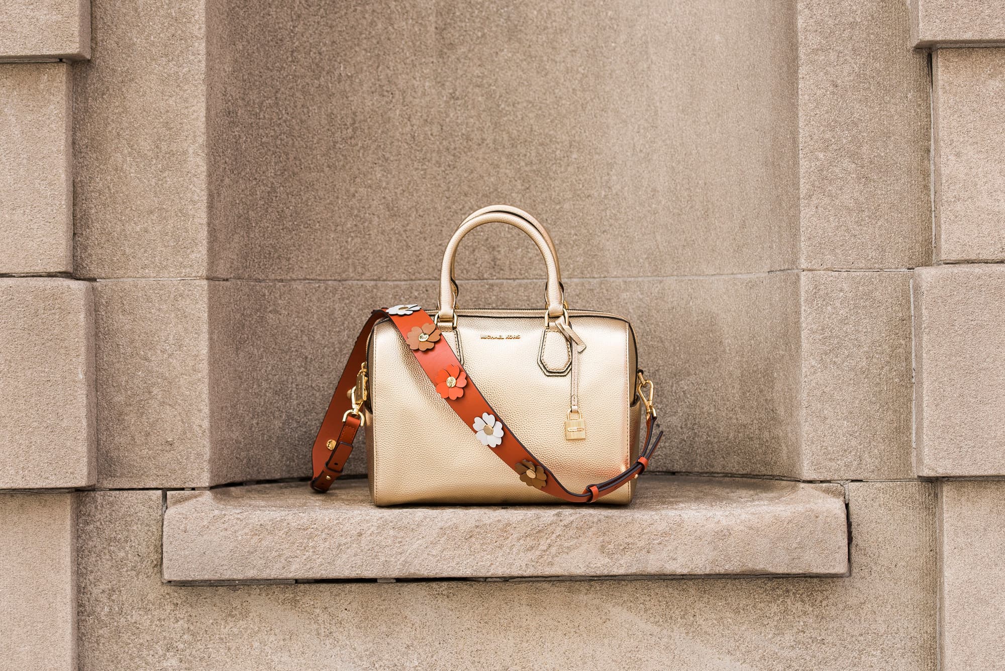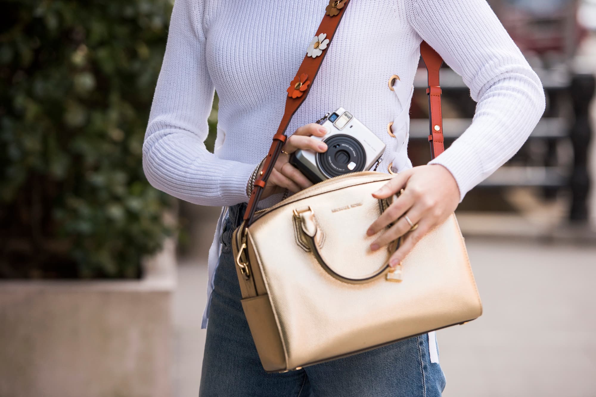 “For the shoot, I wore the Mercer duffel in gold, which is honestly a big style step for me. I rarely wear metallics. I actually love it, though, and love how easily it makes a statement without any effort on my part. Then there was the strap, embellished with leather flowers, and the combination of both took my usual sweater-and-jeans situation to a more exciting place. The best part? I can still be hands-free, and the bag is big enough to carry my entire life with me.”