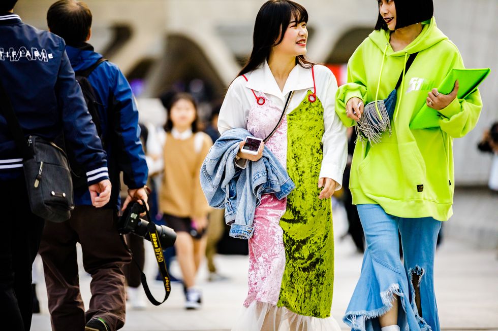 If you’re finding yourself in need of some fall fashion inspiration, look no further than Seoul fashion week. The four-day event wrapped yesterday in a flurry of streetwear, prints (think plaid and argyle), bright and bold makeup, and matching outfits. As a result, our iPhone galleries are currently overflowing with screenshots. There were pops of orange, blue, pink, and slime green hair, head-to-toe monochromatic looks, and many a face masks. Our shopping list also got a whole lot longer after taking in all of the note-worthy handbags that were swinging on the shoulders and arms of showgoers. Another great part about Seoul fashion week? The kids. Pulling off yellow berets and Vetement socks better than we ever could. Click through the below to see a few of our favorite looks from the week.