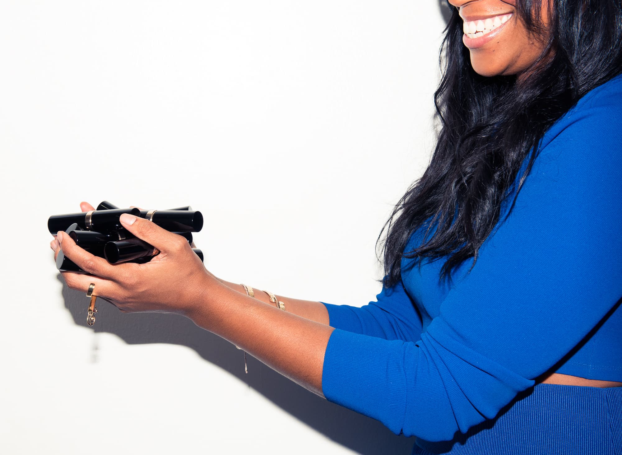“My clothes are quite complicated so I need my makeup to be super simple, easy to use, and get me out the door in fifteen minutes. I dont even carry a bag. Because all I really need is my credit card and phone.