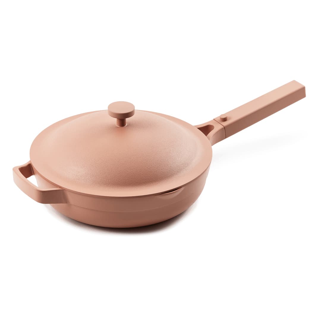 is what I use to cook every meal. It comes with an amazing nesting steamer basket that steams everything from veggies to dumplings (something I have been living off!). It also comes with a nesting spatula and lots of little details that make it easier and simpler and more joyful to cook at it home. We designed the Always Pan to be deep enough to make soup, but shallow enough to flip an egg. It’s really intended for everyday use. It’s beautiful and has a great non-toxic, non-stick coating that makes cleanup a breeze. I also love the stacking