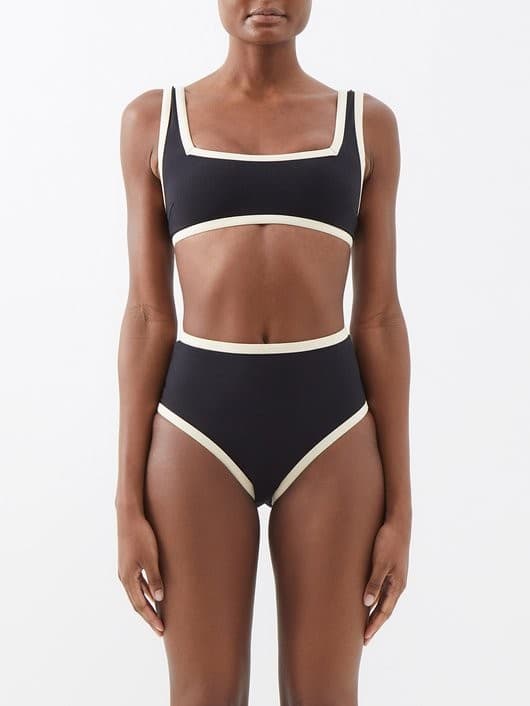 Lean into the nautical spirit this summer with Lisa Marie Fernandez’s sailor bikini. The white piping adds the perfect timeless touch.