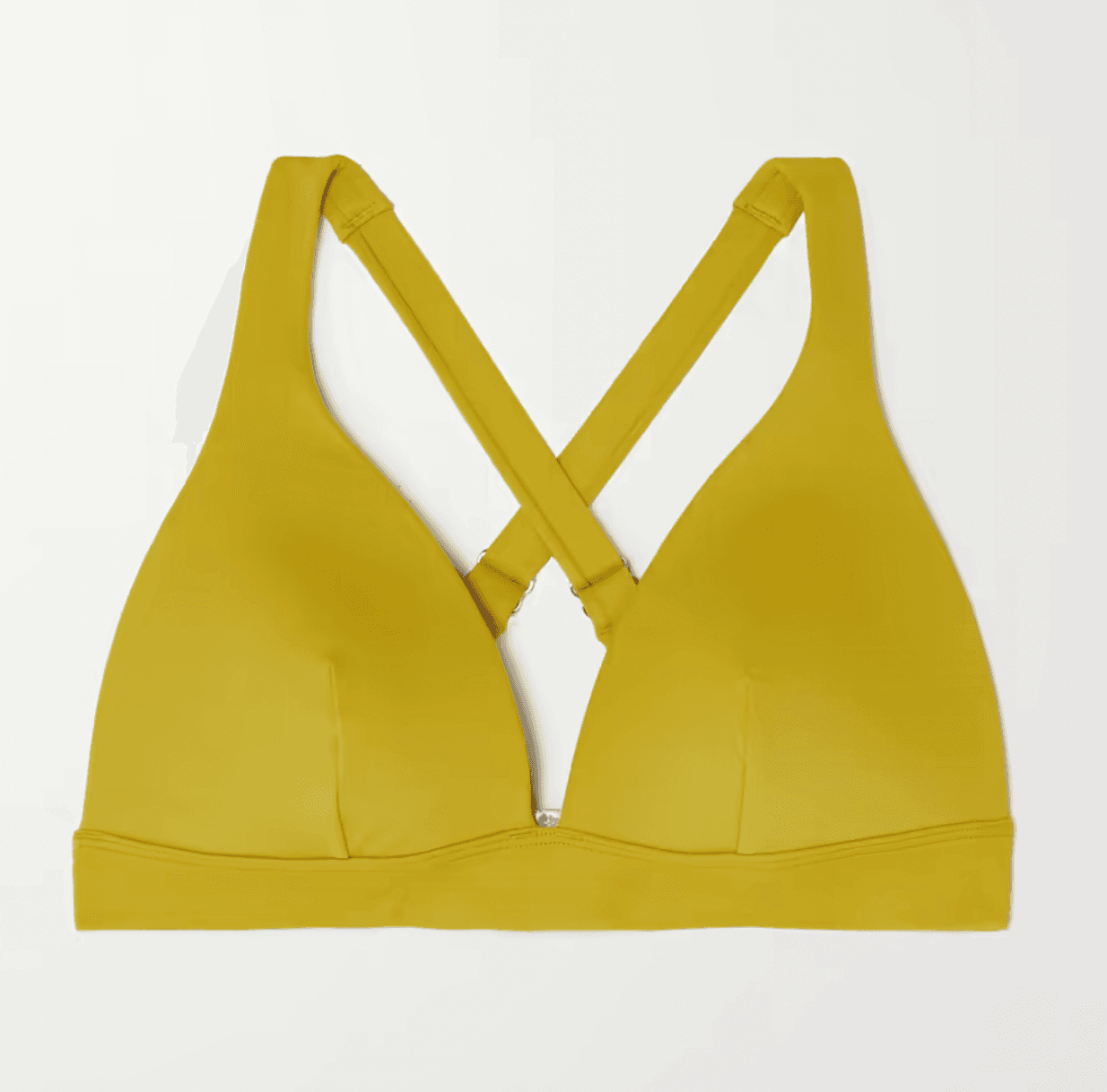 Matteau’s classic string bikini top is made from recycled fibers and rendered in an olive green hue you won’t be sick of by the end of June. We suggest adding their string bikini briefs to your order, as well.