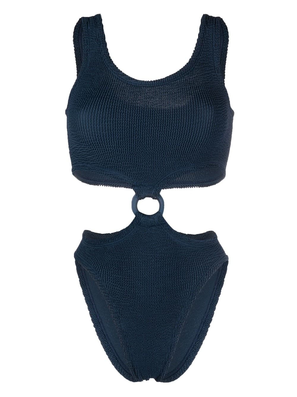 Sustainable swimwear brand Hunza G deployed yet another staple one-piece, this time adding a hoop embellishment and cut-outs for extra intrigue. Their signature crinkle detailing allows their pieces to achieve that elusive one-size-fits-all title.