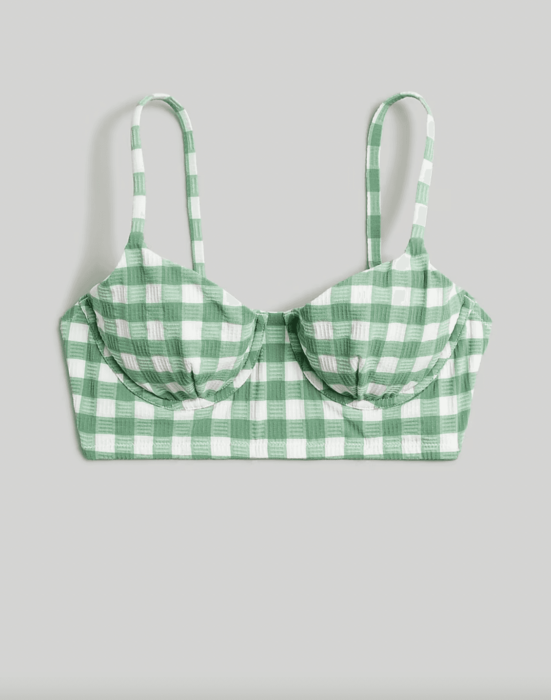 Madewell's take on the underwire top fully embraces the retro energy of the style. The bold green check is perfect for summer while the extended length of the top provides extra support. Add the matching bottoms here.