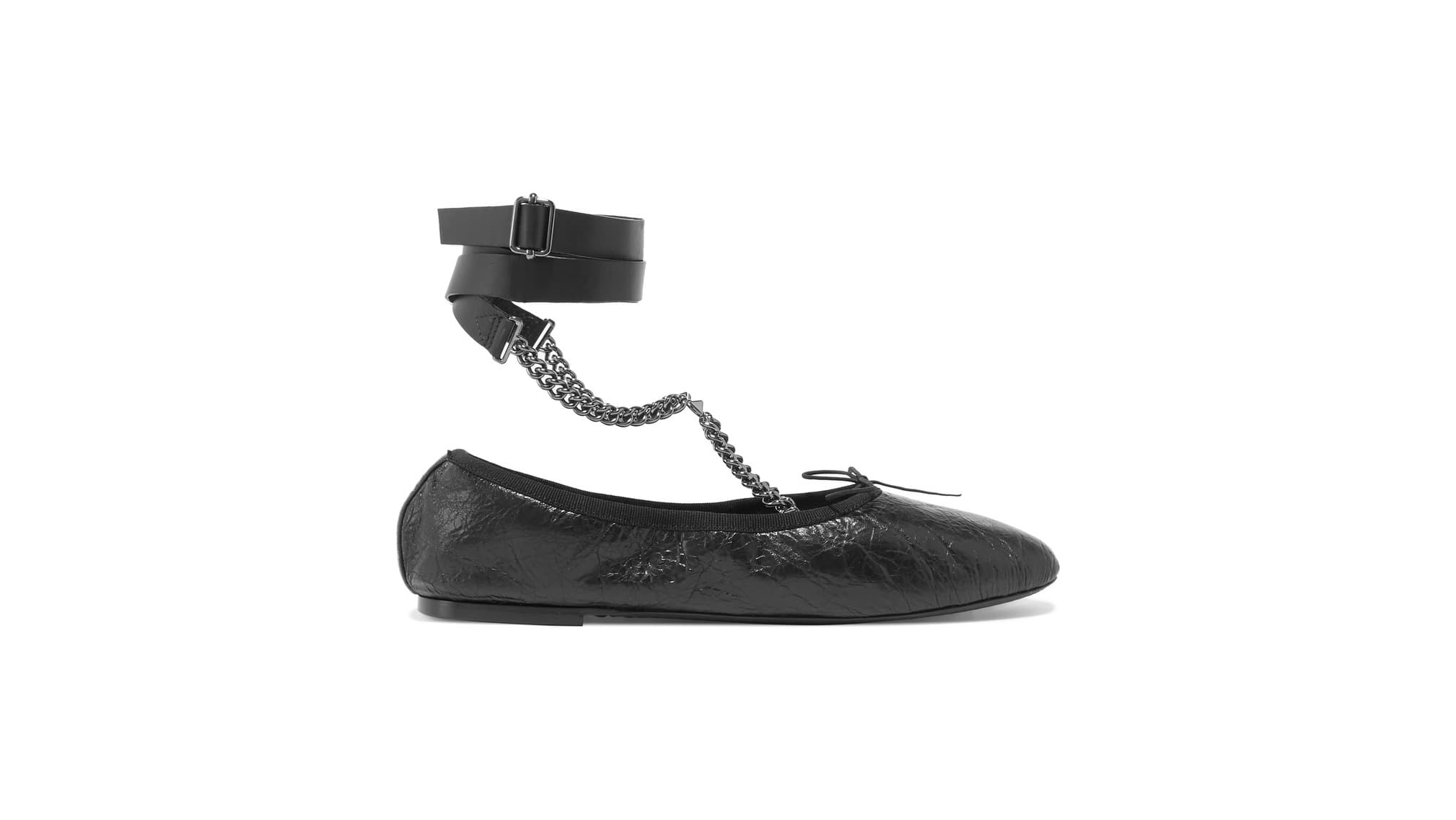 Cracked, glossy leather, interlocking, criss-crossing chains, triple-wrapped ankle straps. The ballet flat is back, only in a way its predecessors likely never imagined possible—and we’ve seen these just about everywhere since.