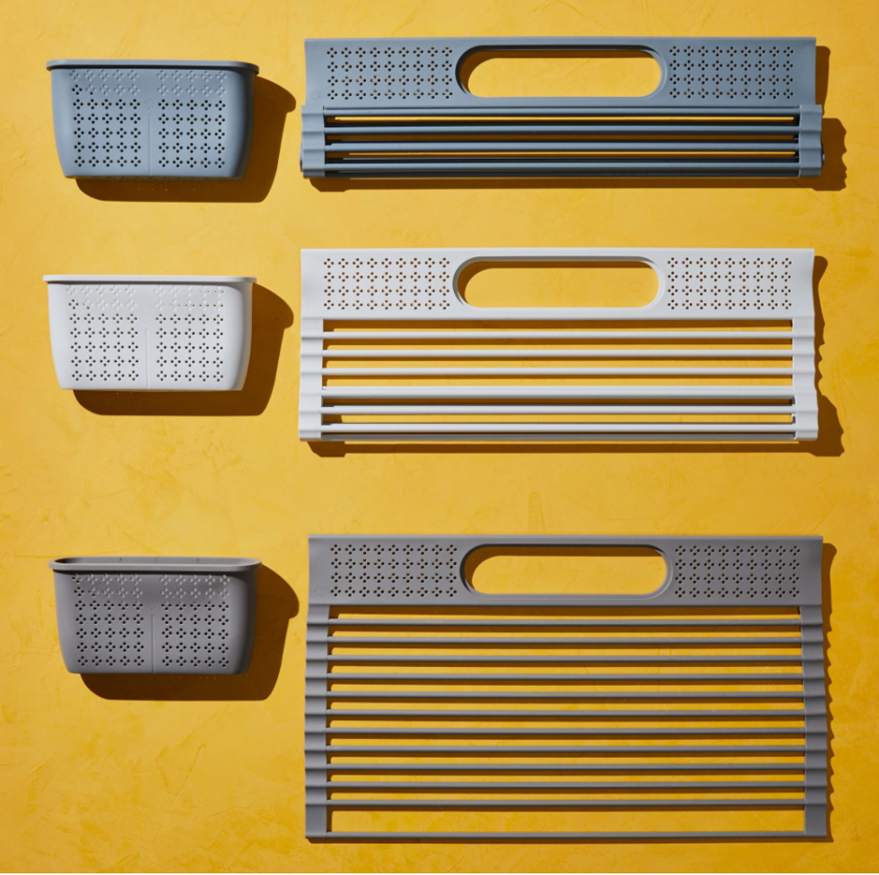 If you're not blessed with a dishwasher, you know all too well how much real estate a drying rack can take up on your kitchen counter. "Say goodbye to bulky kitchen drying racks that take up more of your precious countertop space," Sanford says. "Food52's silicone drying rack rolls over the kitchen sink and is sturdy enough to hold my cast-iron pots. Best part is that it rolls up and tucks right into a drawer."