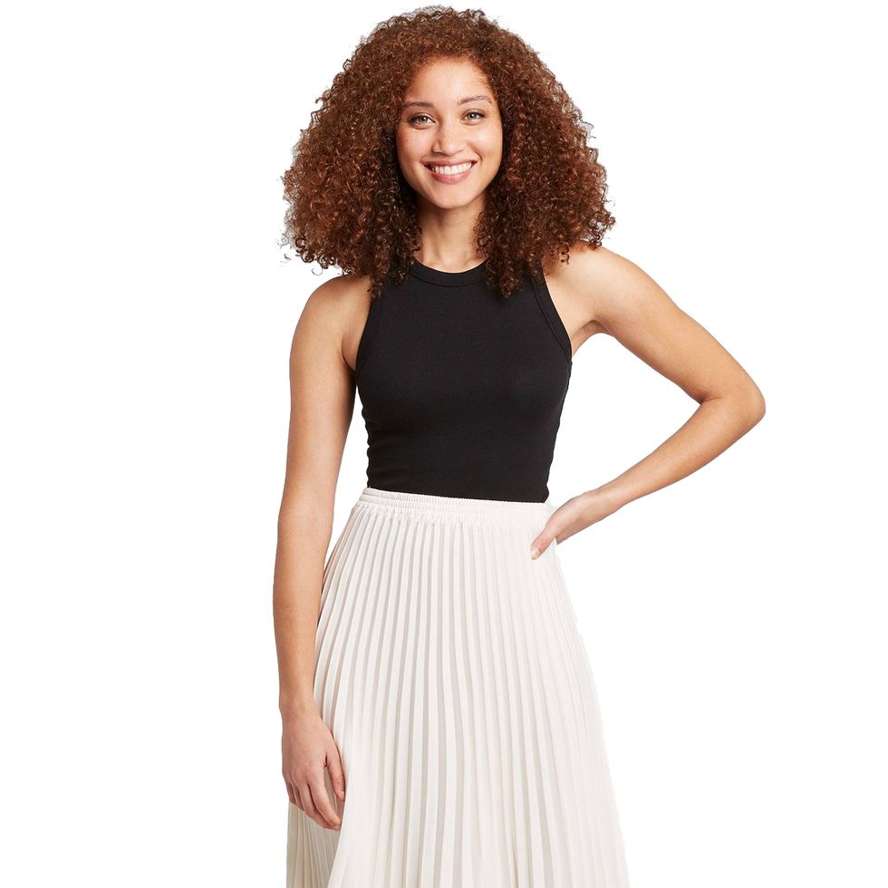 This is without a doubt my favorite tank top, so I always keep a few in my closet to pair with jeans, leggings, and skirts. The high crewneck is easy to dress up or down, and this particular tank is comfortable but still tight enough to pass for a bodysuit.