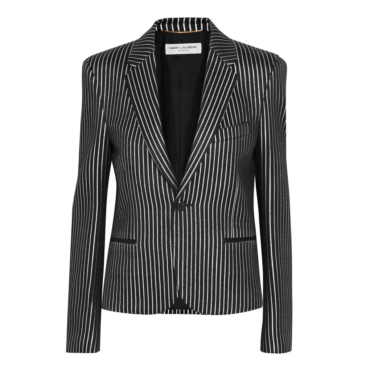 1. Saint Laurent Striped Metallic Jacquard Blazer: This blazer is giving me full “1920s Al Capone” vibes. I love a uniform piece, and blazers are great at pulling any outfit together. I like that it accentuates my small waist. I’d dress it up with a nice mini skirt and some booties, or dress it down with my favorite high-waisted vintage jeans and a t-shirt.