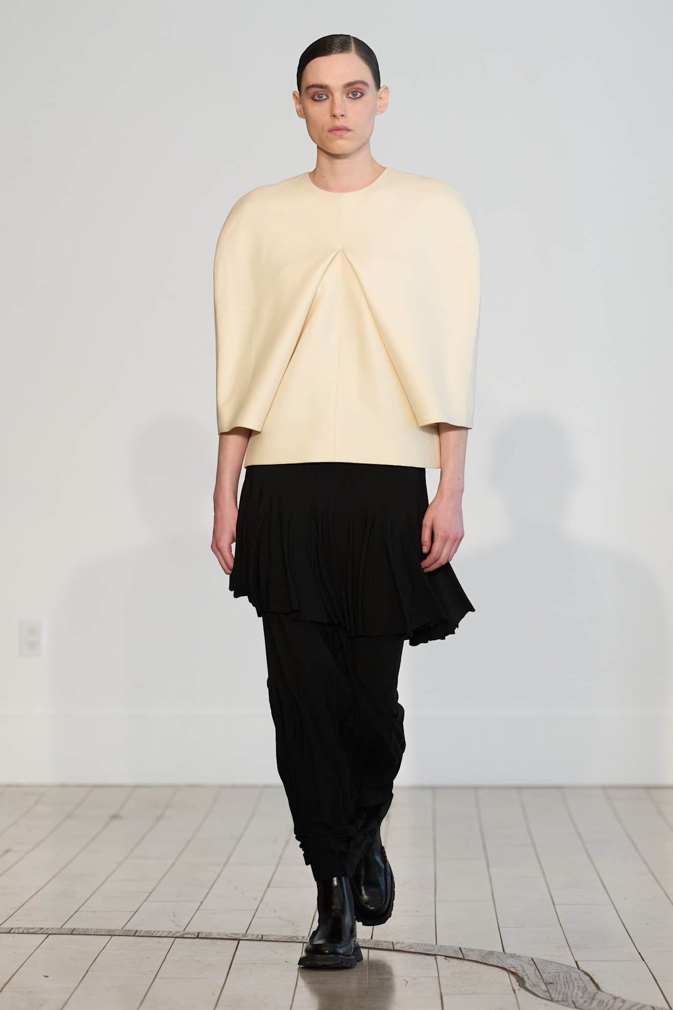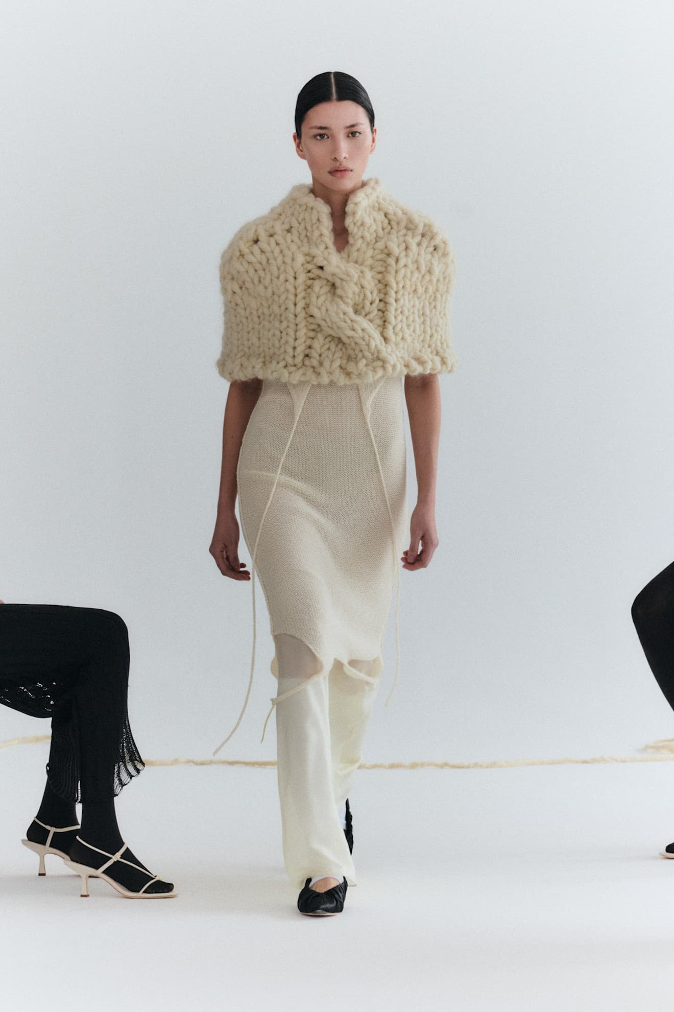 Aisling Camps FW26 LaunchmetricsThe silhouette first popped up at Ashlyn's Fall/Winter 2026 show, where tops had built-in shrouds with rounded shoulders and little front pleats to mimic arm holes. At Aisling Camps, the shroud was interpreted in a chunky, ivory knit, while at Fforme, it was all about pony hair stoles that seemed to lack a beginning or an end. Onto Rachel Scott's Proenza Shouler, where the shroud was wrapped and draped across the body in the form of silk tops and more fluid scarf-like shapes, not dissimilar to Khaite and Altuzarra, who both offered up versions in oatmeal cashmere.